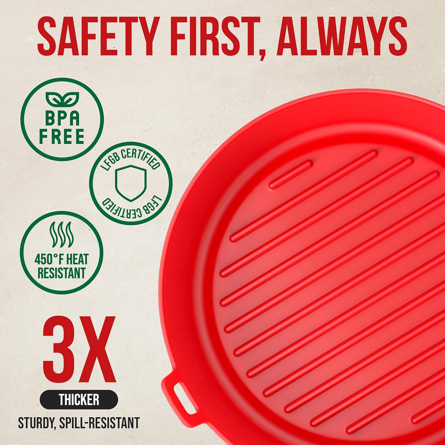 Premium Silicone Liner for Air Fryer – Our silicone tray for air fryers is crafted from high-quality, LFGB-tested and BPA-free silicone. Designed to be 3x thicker than other reusable silicone air fryer liners, it ensures stability, reducing sloshing and the risk of spills, making it the ideal air fryer basket insert for safe cooking