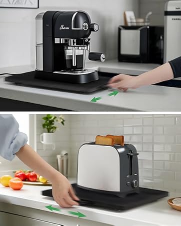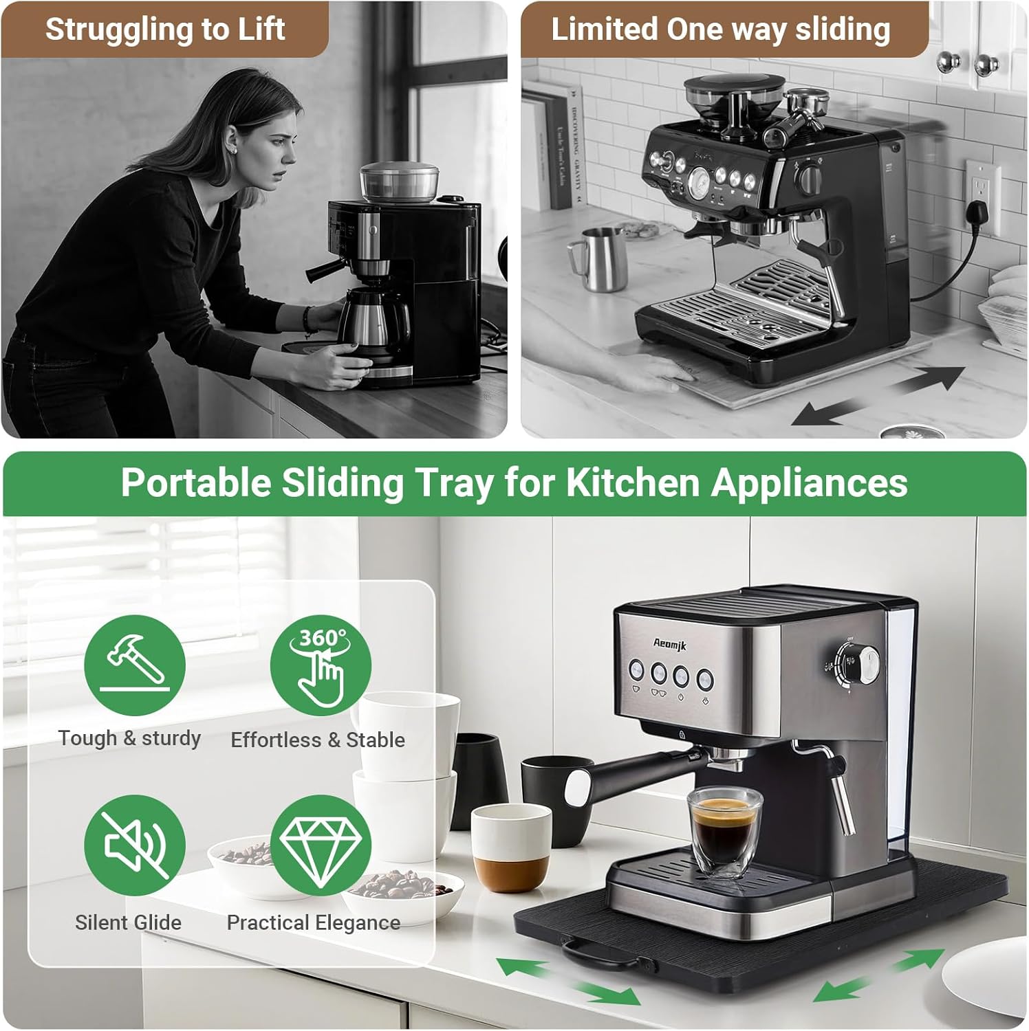 【360° Countertop Mobility】This coffee maker sliding tray features premium 360° swivel wheels, allowing you to effortlessly pull out heavy kitchen appliances like coffee makers, air fryers, and more from under cabinets. Prevent steam damage and protect your countertops. Whether you’re grabbing your coffee machine, prepping dough for bread, or cooking a meal, the tray offers a fluid motion, making it easy to reposition your devices exactly where you need them.