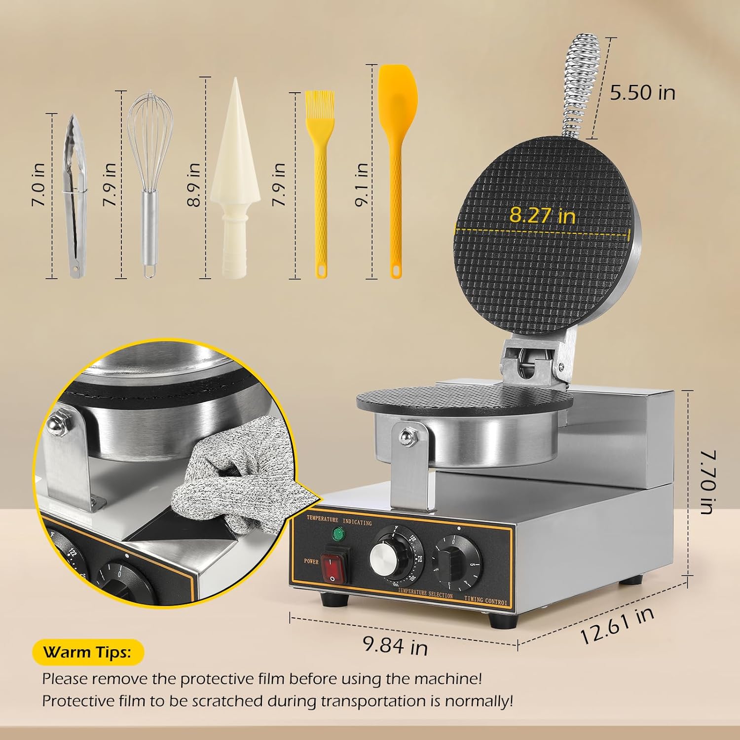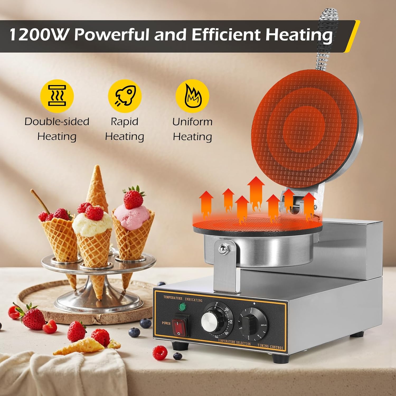 [Independent Time and Temperature Control]- The waffle cone maker is equipped with an independent temperature selector and timing controller, you can precisely control the temperature and working time to make delicious ice cream skin production. It is simple to operate.