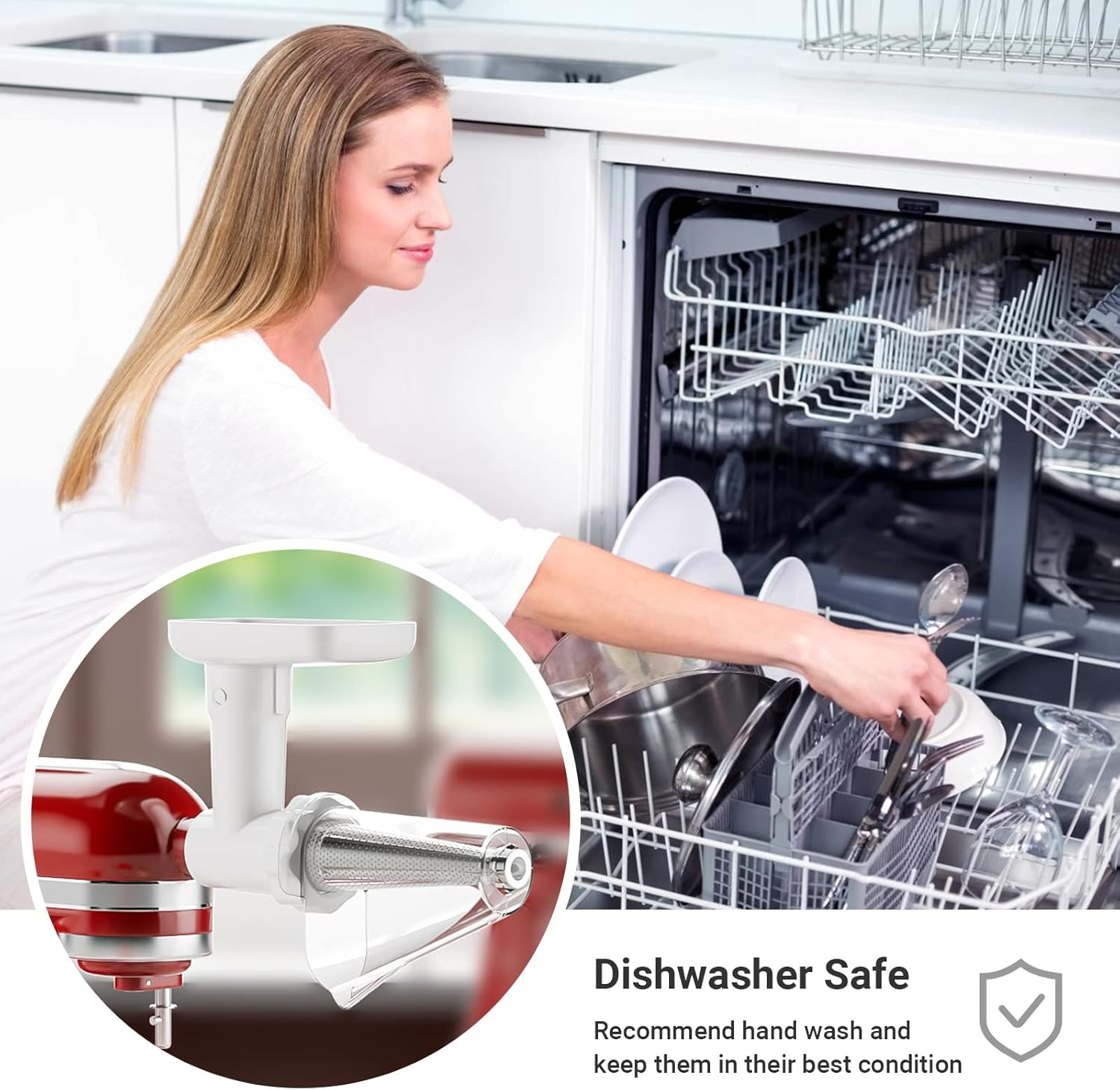 Dishwasher Safe. For kitchenaid fruit and vegetable strainer attachment and meat grinder for kitchenaid, all parts are detachable and dishwasher safe. The provided cleaning brush can clean any hidden crevices or corners. If you have any questions about the product, please contact us.