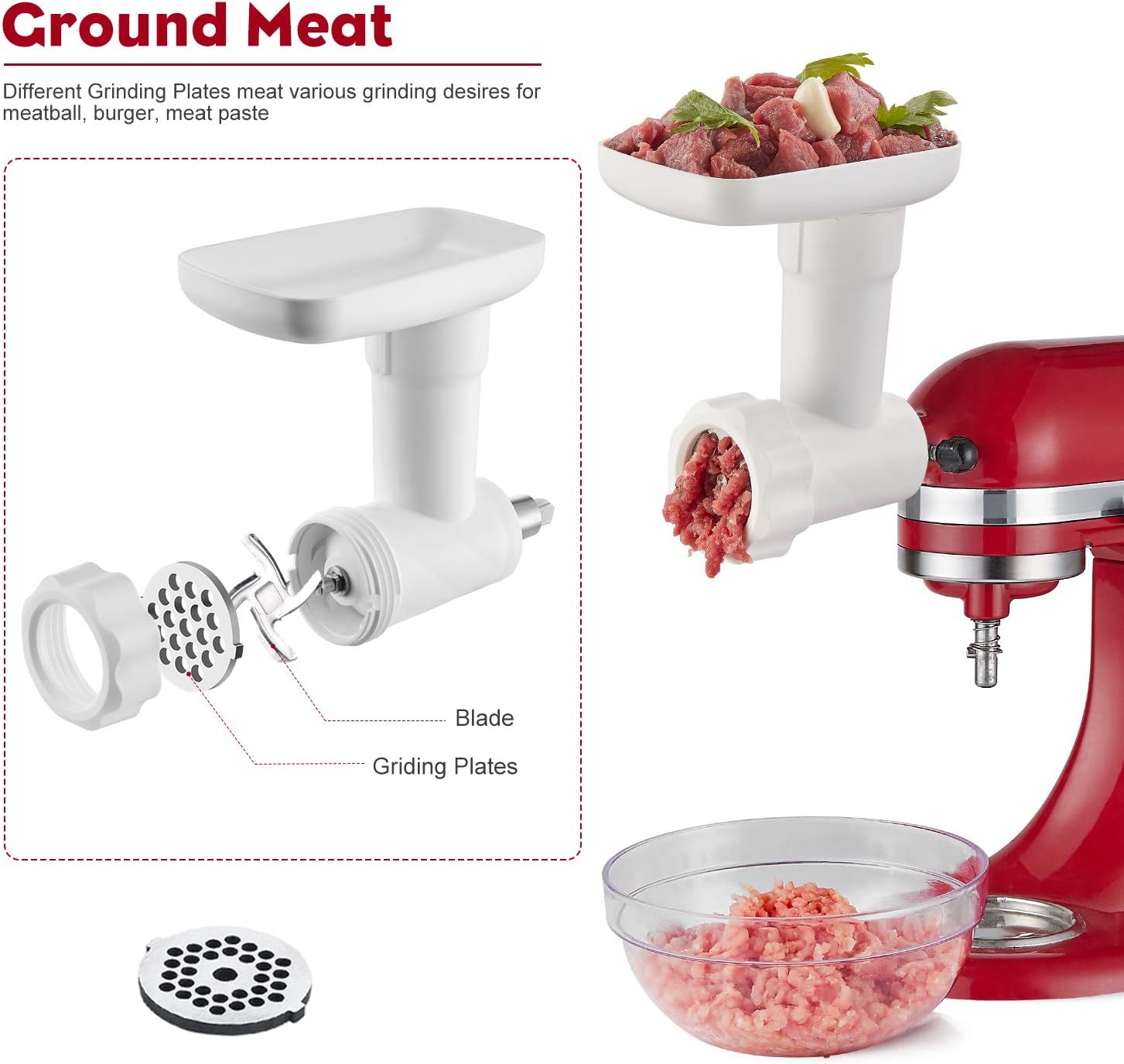 Meat Grinder Attachment for KitchenAid Stand Mixer: Durable and excellent kitchenaid mixer attachments includes 2 Grinding Blades, 2 Grinding Plates, 2 Sausage stuffer Tubes, 1 Retainer Ring. Grinding plates and grinding blades can be used together to handle a lot of food easily, such as raw, cooked meat etc. The Retainer Ring holds the Sausage stuffer Tubes in place to make two different sizes of sausage.
