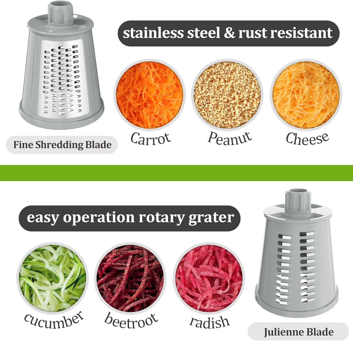 Safe Material: All parts of the rotary cheese grater are made of food grade ABS material; The five blades are made of stainless steel , which is sharp and rust resistant; Keep your ingredients safe and health