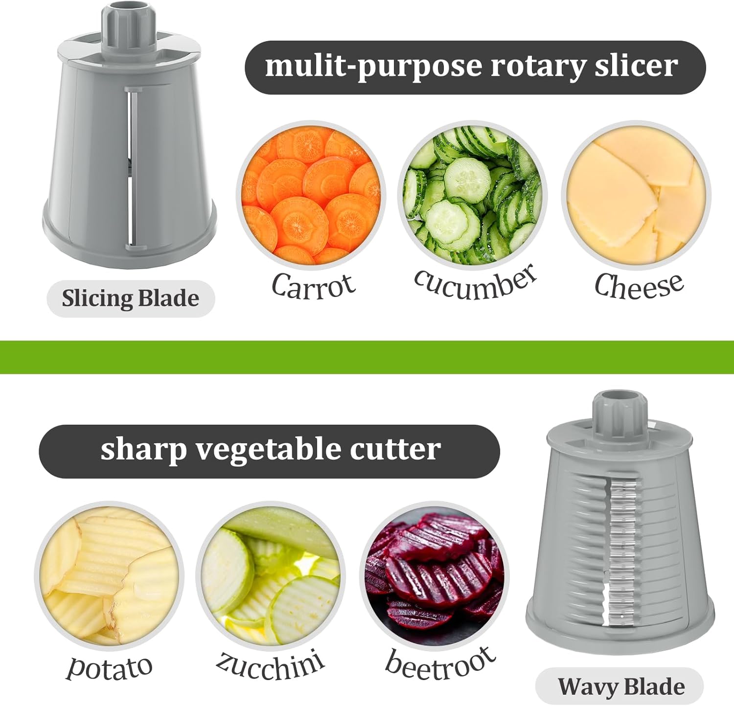 5 Interchangeable Blades: The vegetable grater include shredding blade, coarse grinding blade and fine grinding blade in different diameters are used for shred vegetables or cheese; Slicing blade and wave cutting blade are used for food slicer