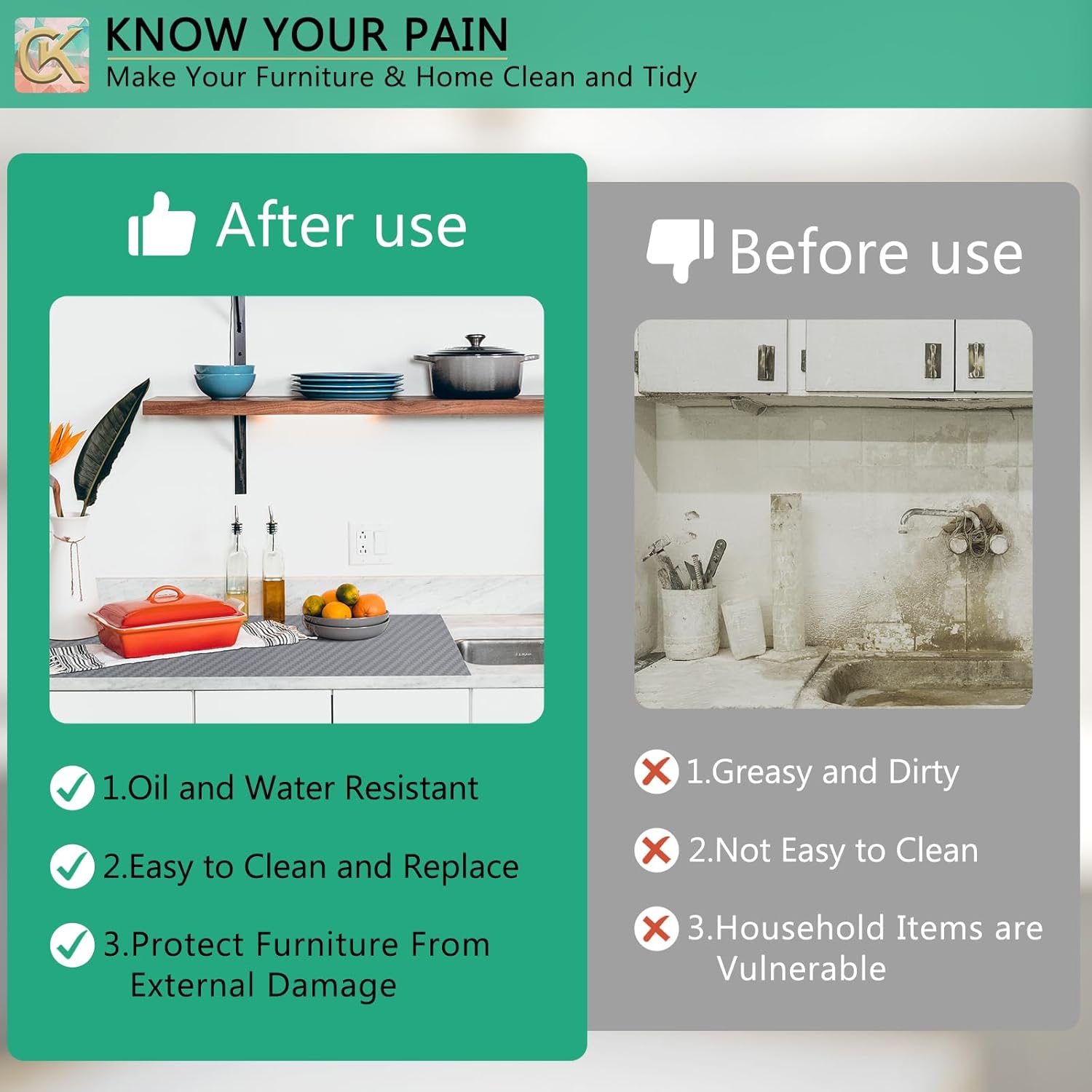 Non-Slip And Waterproof: Shelf liners have a textured and grip-enhanced surface that helps keep items in place, preventing them from sliding or shifting. The adhesive-backed kitchen mat has waterproof properties, which can prevent water from penetrating under the countertop and protect the countertop from liquid damage.
