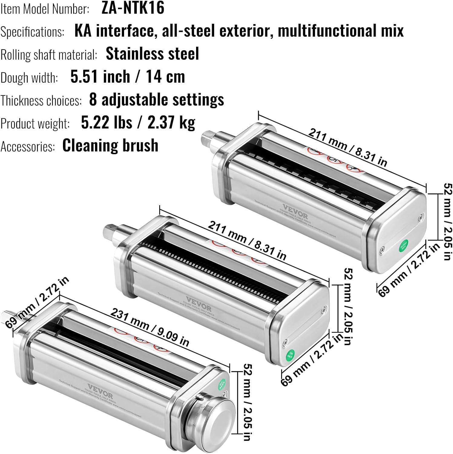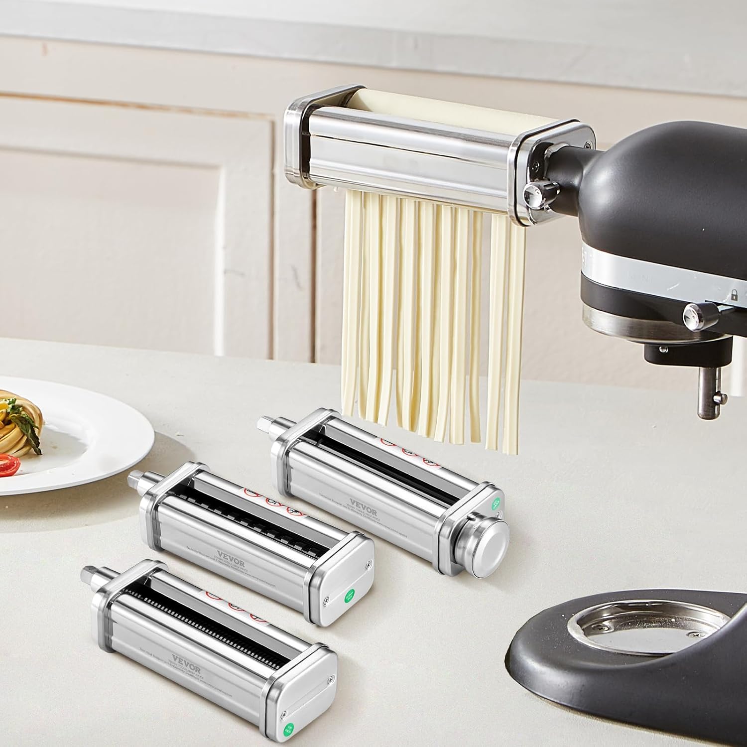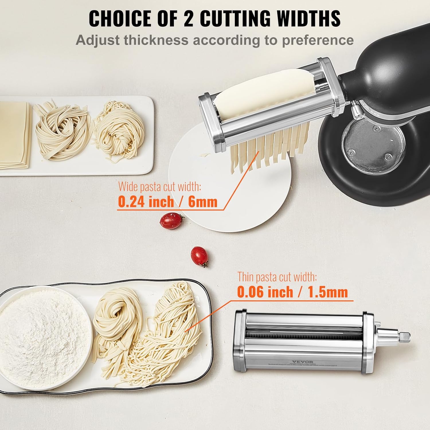 VEVOR Pasta Attachment for KitchenAid Stand Mixer, Stainless Steel Pasta Maker Attachment Includes Pasta Sheet Roller, Spaghetti Cutter, Fettuccine Cutter, 8 Adjustable Thickness Knob Pasta Maker 3Pcs