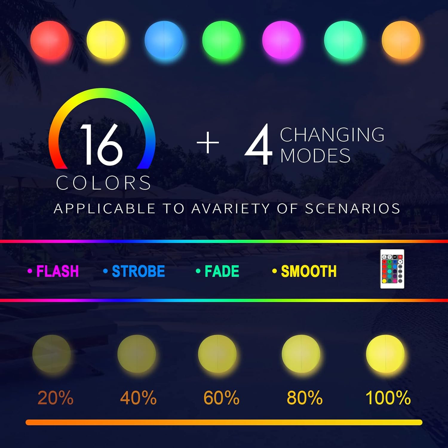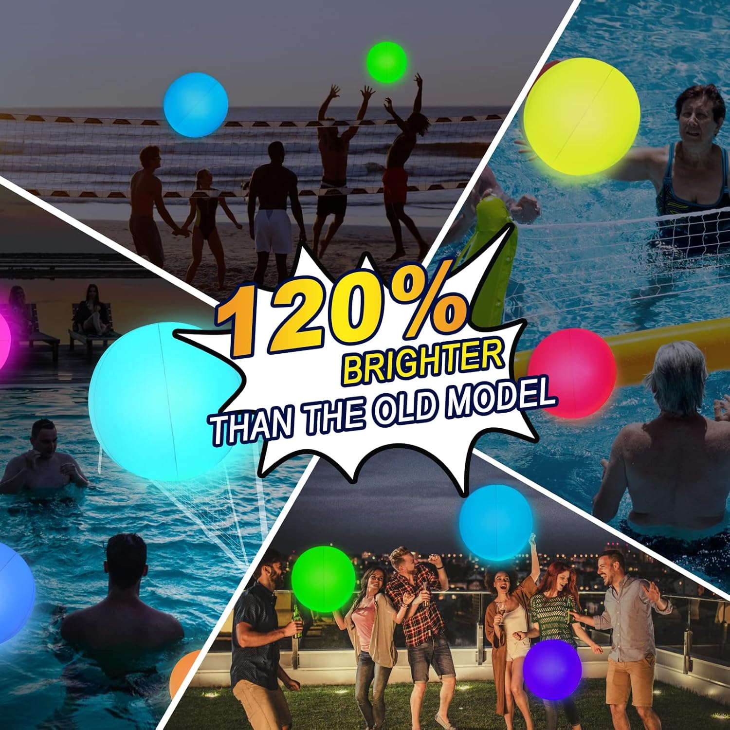 [Rechargeable Pool Lights] : Upgrade to a rechargeable large-capacity battery for the pool lights, making it the only beach ball on the market that can be charged.ensuring 10-15 hours of continuous use and vibrant illumination.The lights offer 16 colors and 4 modes, creating a vibrant and captivating visual experience.