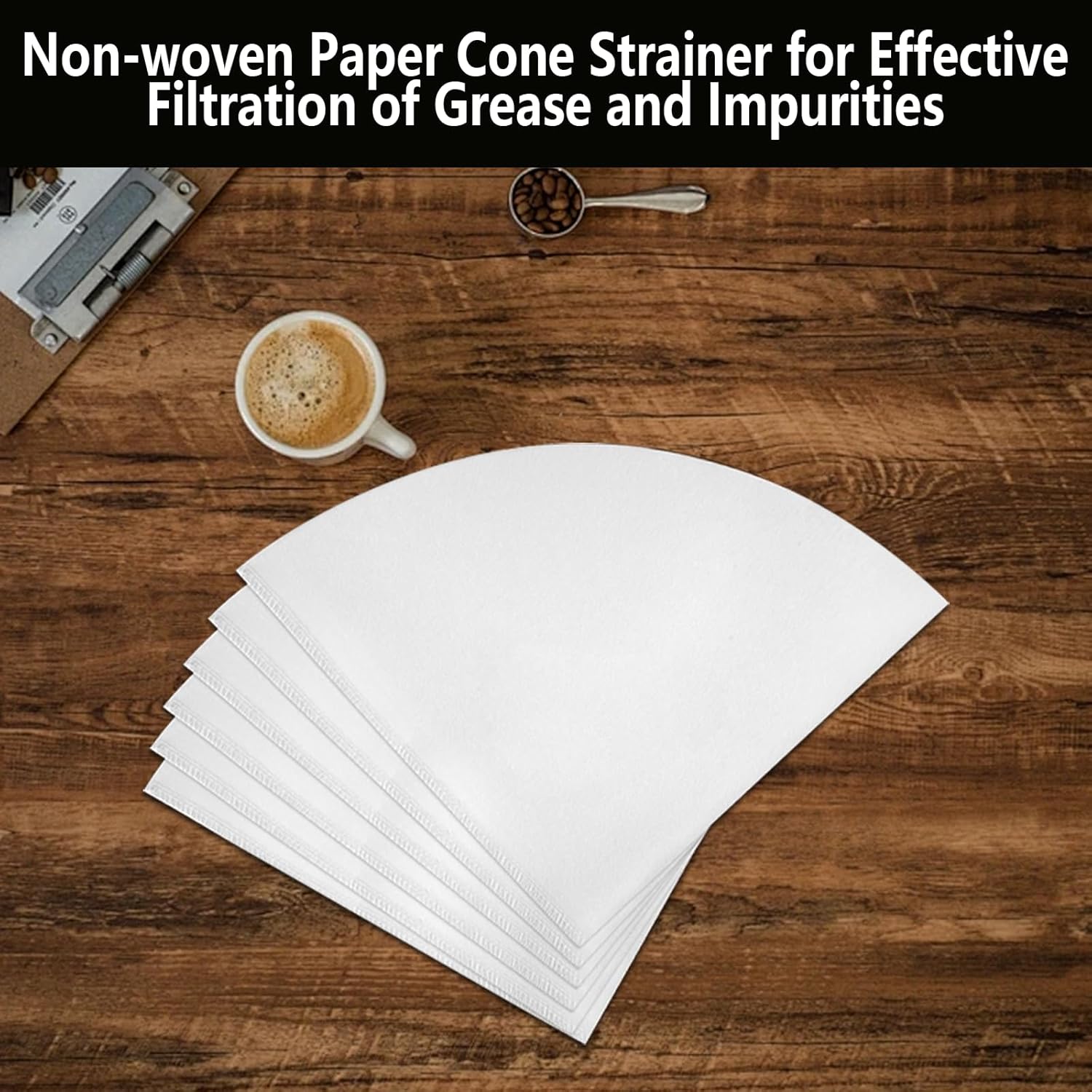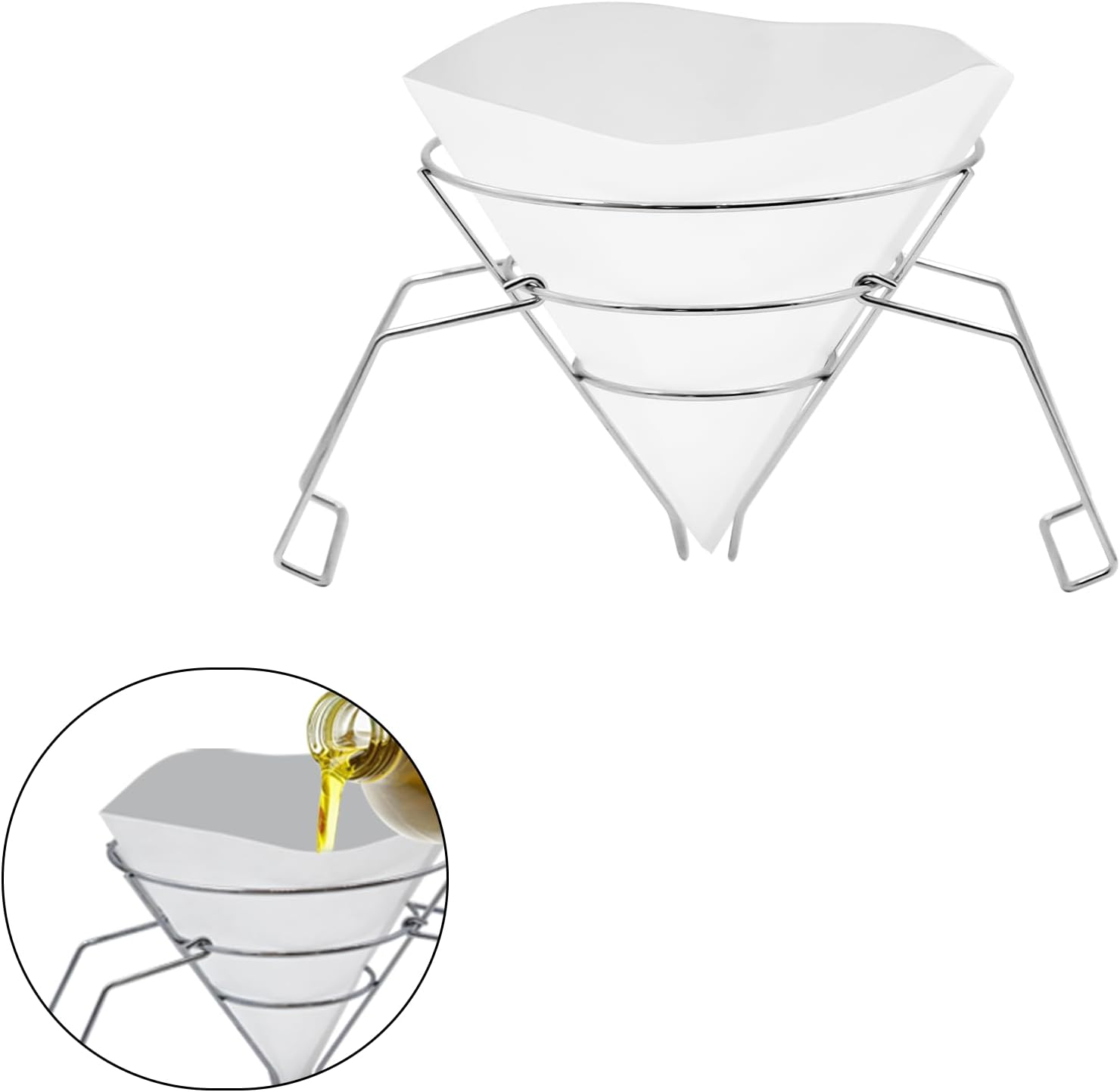 【Enhanced Kitchen Efficiency】: This Oil Cone Filter Holder comes with 1 holder, 2 detachable handles, and 25 precision filter papers. The Commercial Cone Filter adapts securely to pots or containers, making oil and syrup filtration more efficient and helping streamline your kitchen’s productivity.