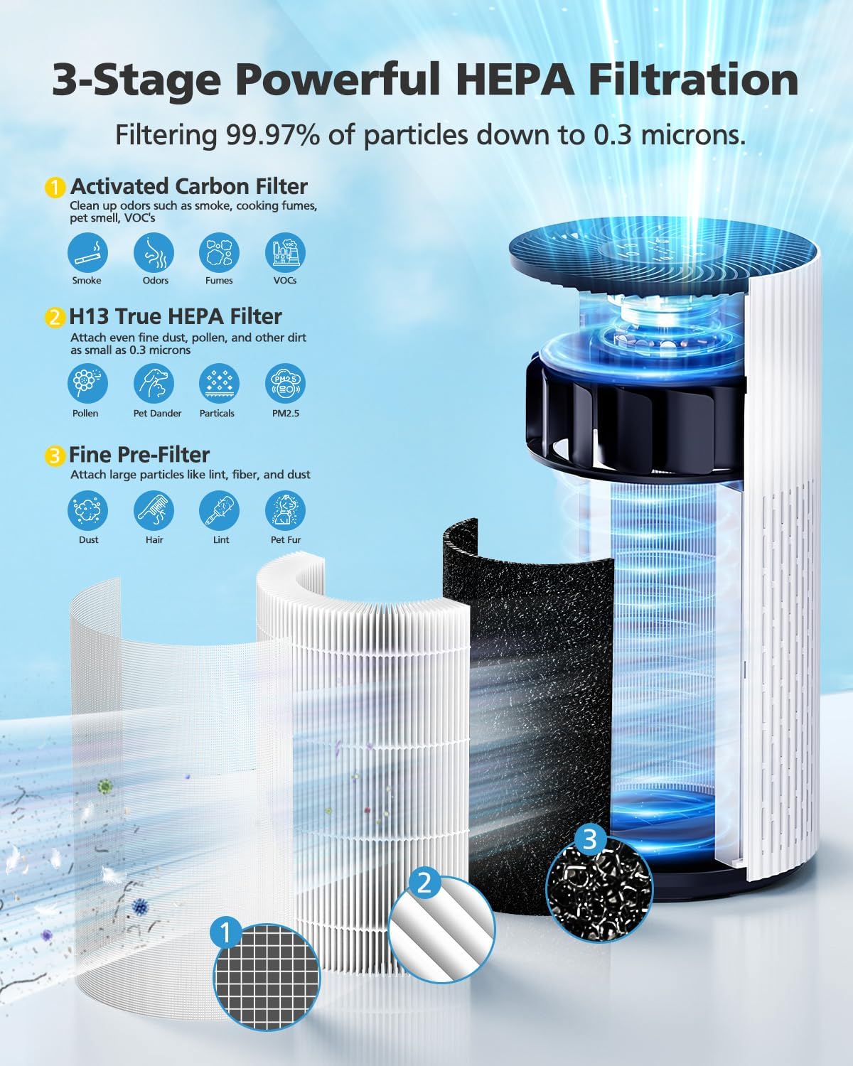 3-STAGE FILTRATION SYSTEM : The 360° 3-stage filtration system combines a fine preliminary filter layer, a H13 True HEPA filter layer and an activated carbon filter layer. This 3-in-1 high-efficiency HAP604 filter effectively captures particles and odors, delivering clean, fresh air to your home or office all day long.