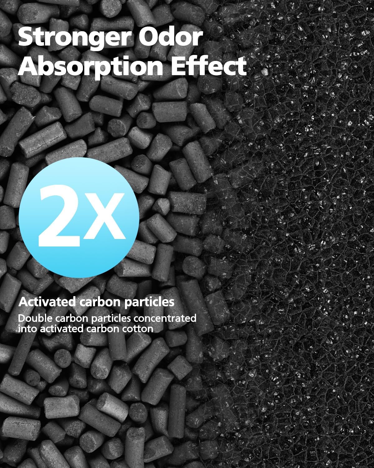 POWERFUL ACTIVATED CARBON FILTER : The activated carbon filter layer captures dust, pet hair, and large particles while prolonging the HEPA filter’s lifespan. Specially treated carbon effectively absorbs volatile organic compounds and minimizes odors from smoke, cooking, and pets. To maintain optimal performance and odor control.