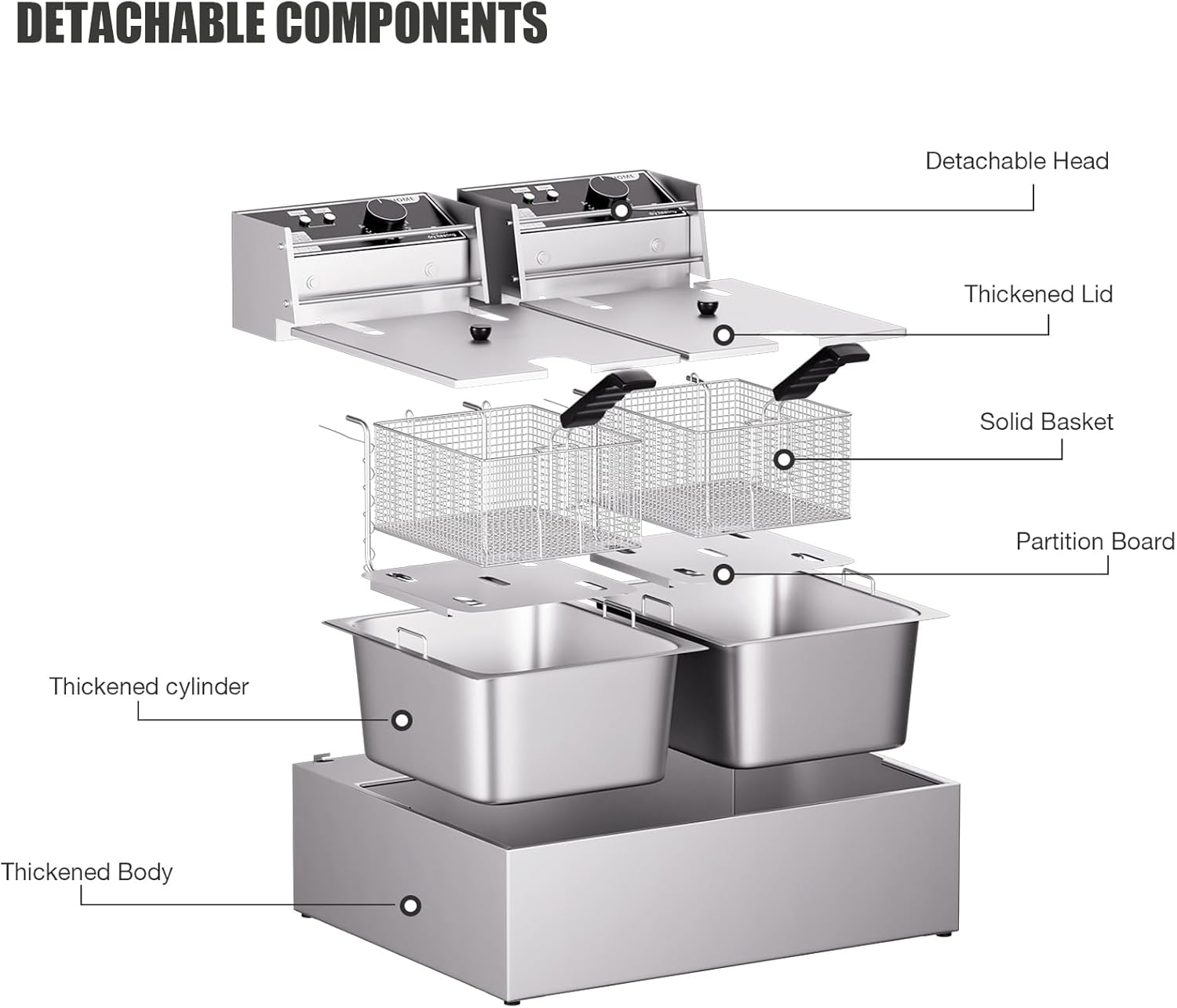 LARGE CAPACITY – The total max capacity is 20.7QT/19.6L(10.35QT/9.8L for each basin) and the fryer baskets capacity are 12.7QT/ 12L(6.35QT/6L for each fryer basket). Constructed with heavy duty stainless steel, two heavy duty fry baskets is included. the commercial deep fryer has two high-efficiency stainless heating elements