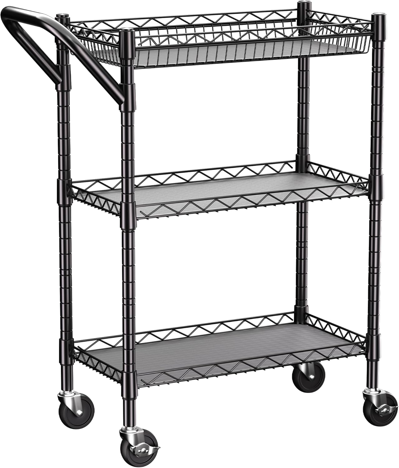 3 Tier Heavy Duty Rolling Utility Cart,18″ D x 23.8″ W x 36.6″ H Rolling Carts with Wheels,Commercial Grade Metal with Handle Bar & Shelf Liner,Trolley Serving Storage Cart for Kitchen Black