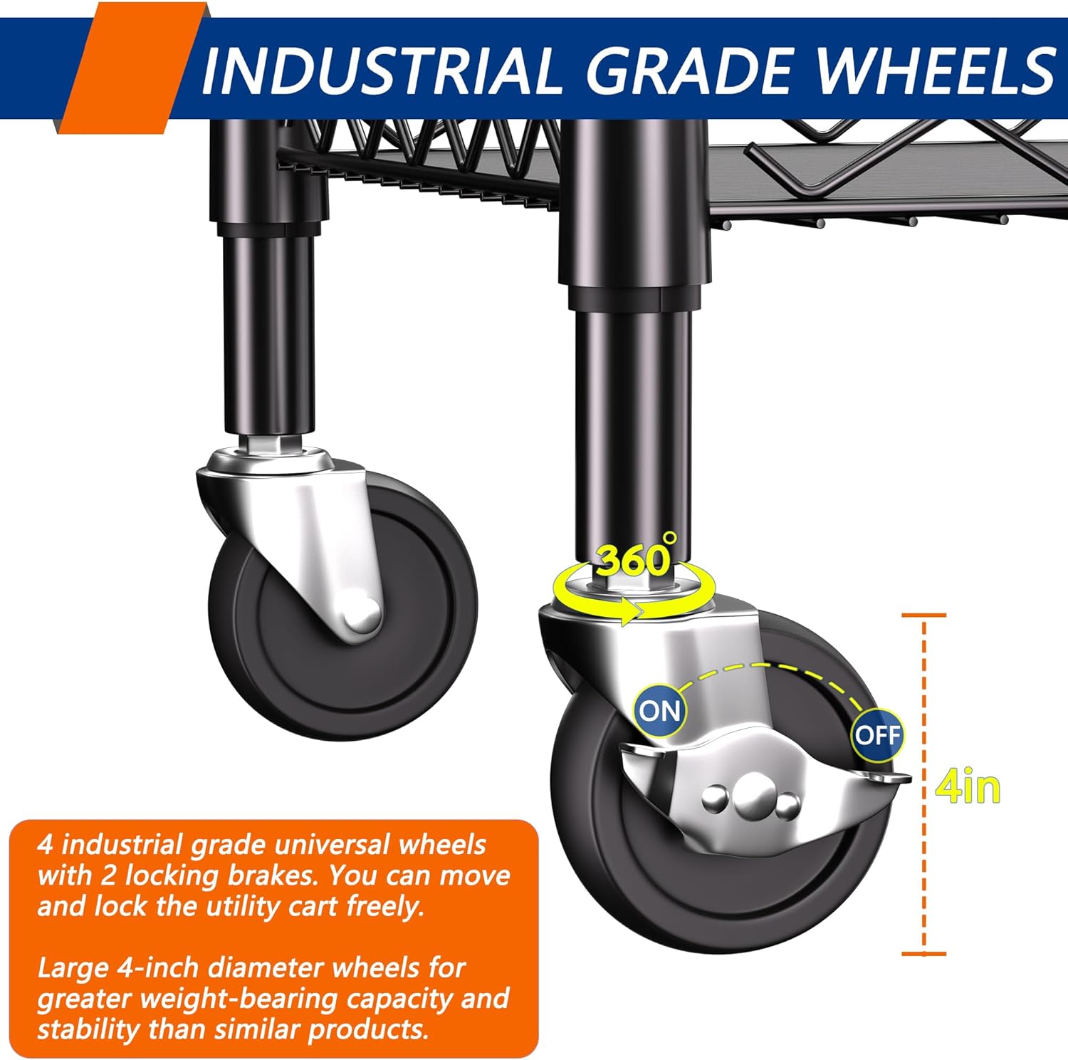 360° INDUSTRIAL CASTERS: So easy installation and DIY fun. The 3 Tier Heavy Duty Rolling Utility Cart is designed with 4 industrial casters to transport heavy objects quickly and smoothly, and includes two wheels with fixed locks that can be fixed or moved at any time.