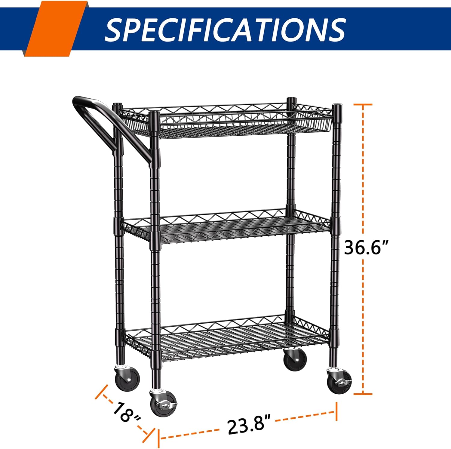 SMART STORAGE: 3 Tier Heavy Duty Rolling Utility Cart measures 18″D x 23.8″W x 36.6″H (including wheels) and has side handles to help you move it easily during use. Ideal for kitchens, warehouses, garages, offices, restaurants and schools to simplify the transportation of heavy goods.