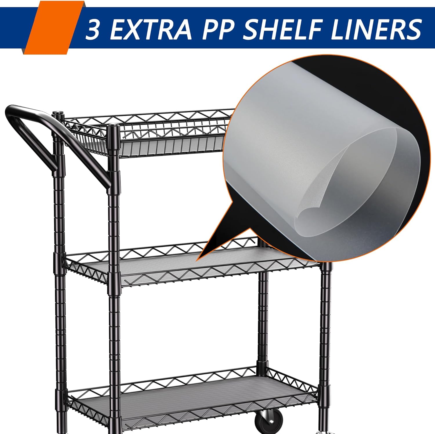 A STABLE FRAME: 3 Tier Rolling Utility Cart Made of high quality industrial strength metal with 1-inch diameter posts. Compact mesh construction that is thick (with Shelf Liner) and does not wobble.900 lb weight capacity ensures a stable lifespan and can hold heavy items without sagging shelves.