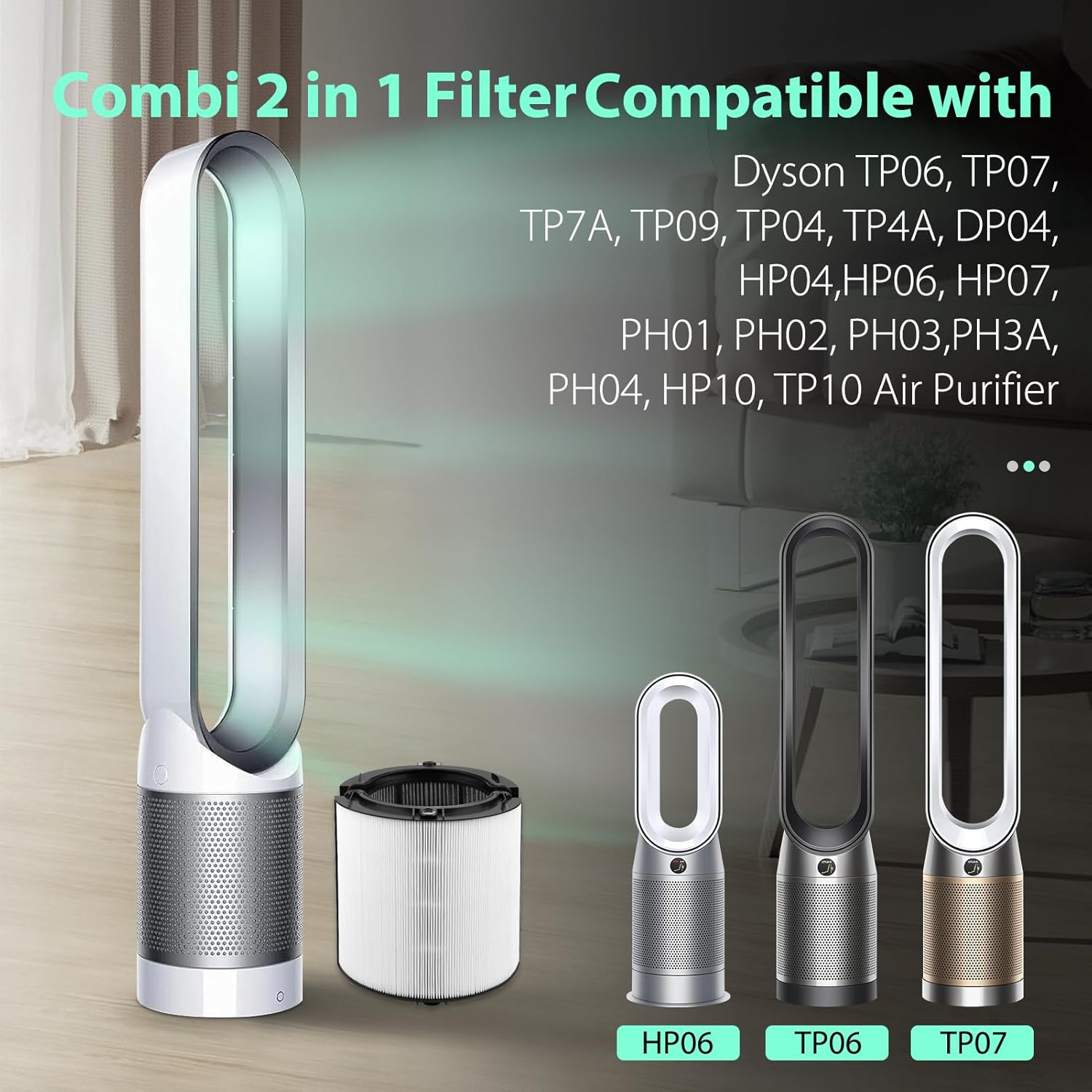 Wide Compatibility —- Our 360° combi filters are fully compatible with Dyson TP06, TP07, TP7A, TP09, TP04, TP4A, DP04, HP04, HP06, HP07, PH01, PH02, PH03, PH3A, PH04, HP10, TP10, working great as original filter. However, the 2-in-1 TP06 filter is NOT compatible with TP03, TP02, TP01, AM11, BP01, HP02, HP01, DP02, DP01.