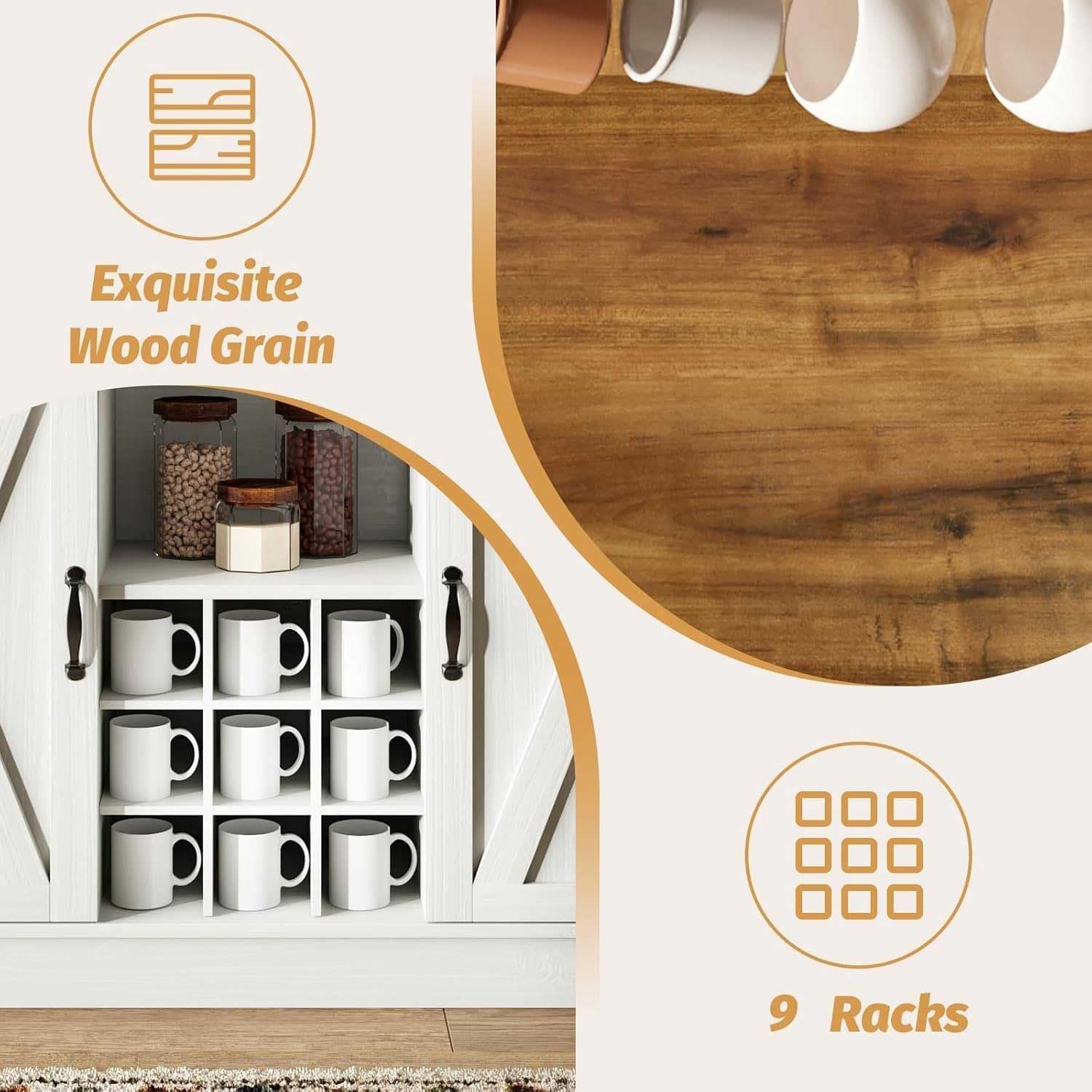 [Farmhouse & Classic Coffee Bar]: This coffee bars cabinet is designed with an X-shaped sliding barn door for easy mobility. Flexible barn doors can slide to either side to create closed storage cabinets. Sliding doors can create a symmetrical aesthetic on either side or in the middle. Classic white and wood grain desktop combination, presenting a farmhouse modern style design