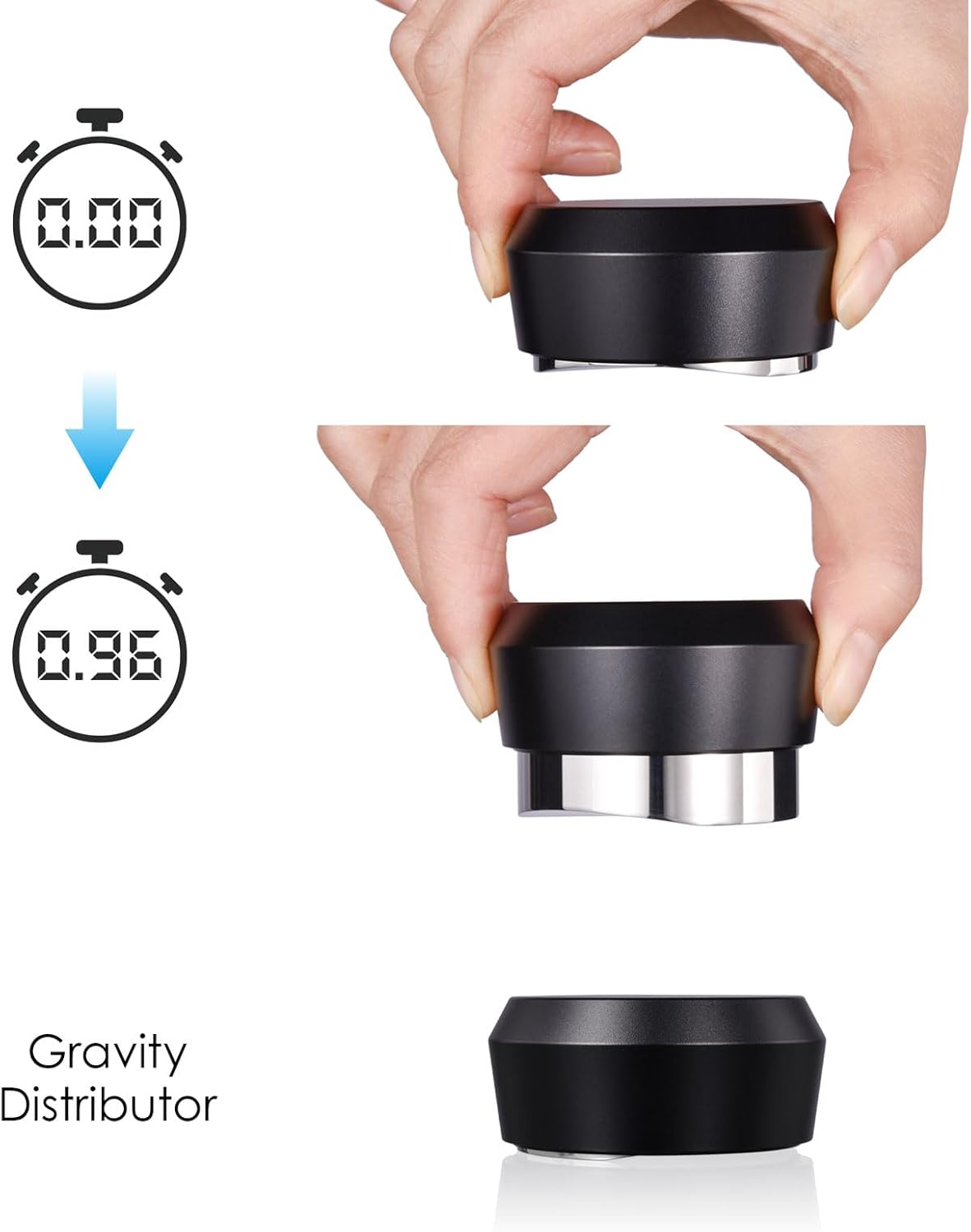 GRAVITY ADAPTIVE DISTRIBUTOR DESIGN – When you lift the whole distributor, affected by gravity and internal air pressure, the distributor will automatic falling down, you only need to rotate the distributor, this distributor’s blade will find the perfect resistance on the puck bed, smoothing out the coffee ground utilizing every gap. Resulting in a perfect distribution every time.