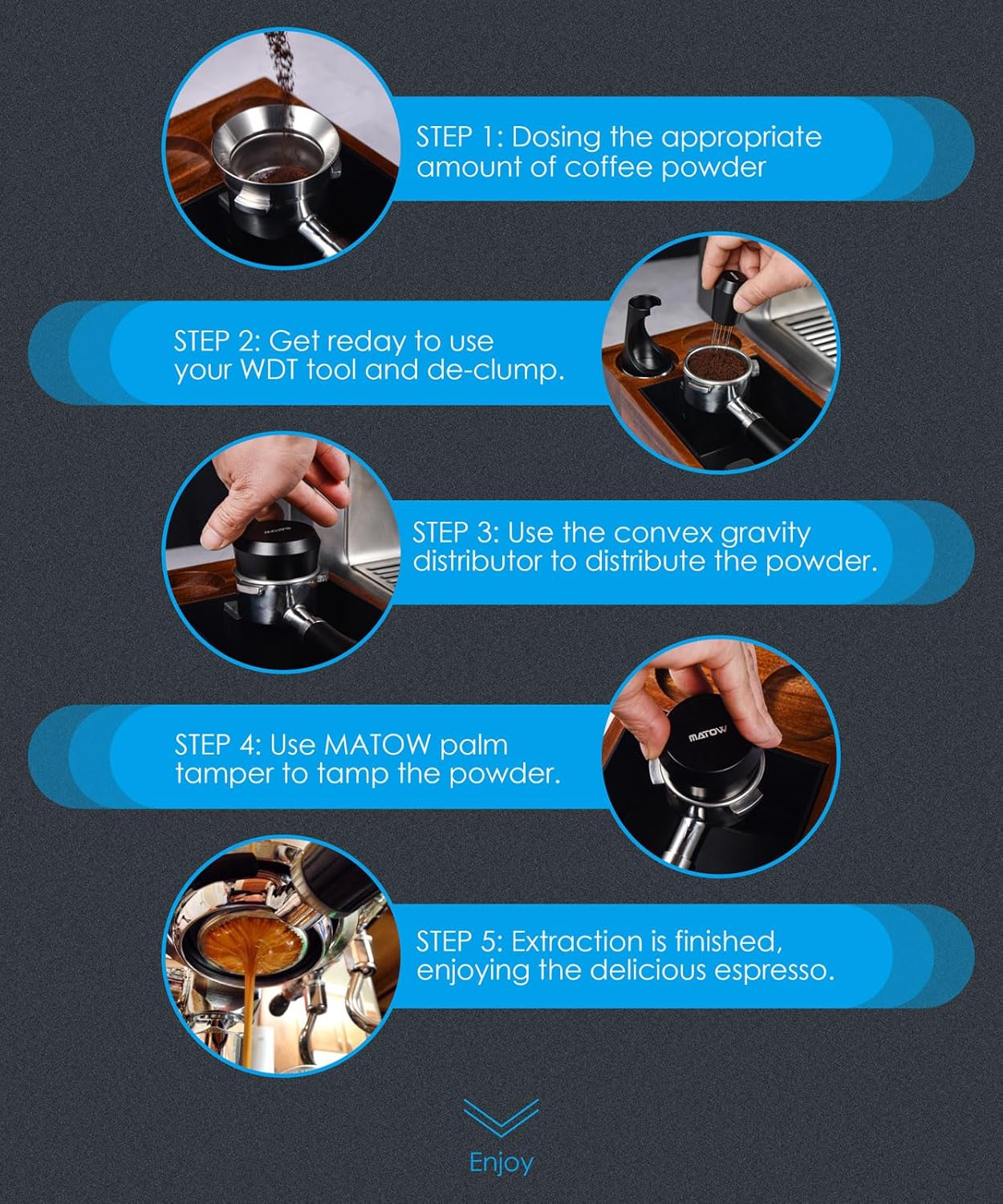 PAIRED WITH MATOW PALM TAMPER – This Distributor & Leveler pairs well with the MATOW palm tamper as the next step in your espresso brewing experience. After creating a polished surface that eliminates the opportunity for channeling or an uneven extraction, you can utilize our palm tamper to compress the coffee for a perfect extraction.