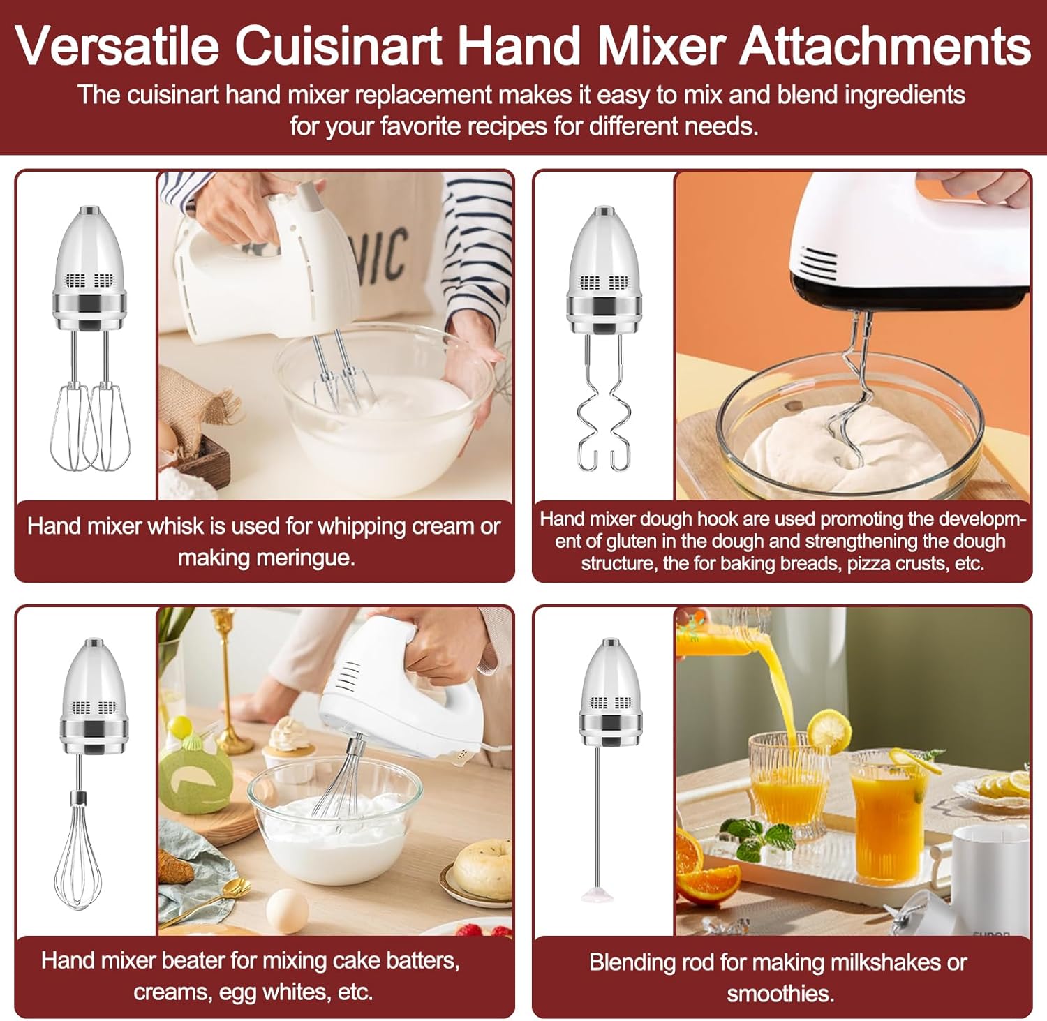 Versatile Cuisinart Hand Mixer Attachments: These cuisinart mixer attachments set includes blending rod and dough hooks, cuisinart mixer dough hooks are used to promote the development of gluten in the dough and to strengthen the dough structure, especially important for baking breads, pizza crusts, etc. And blending rod is used to make milkshakes or smoothies, take your culinary creations to the next level!