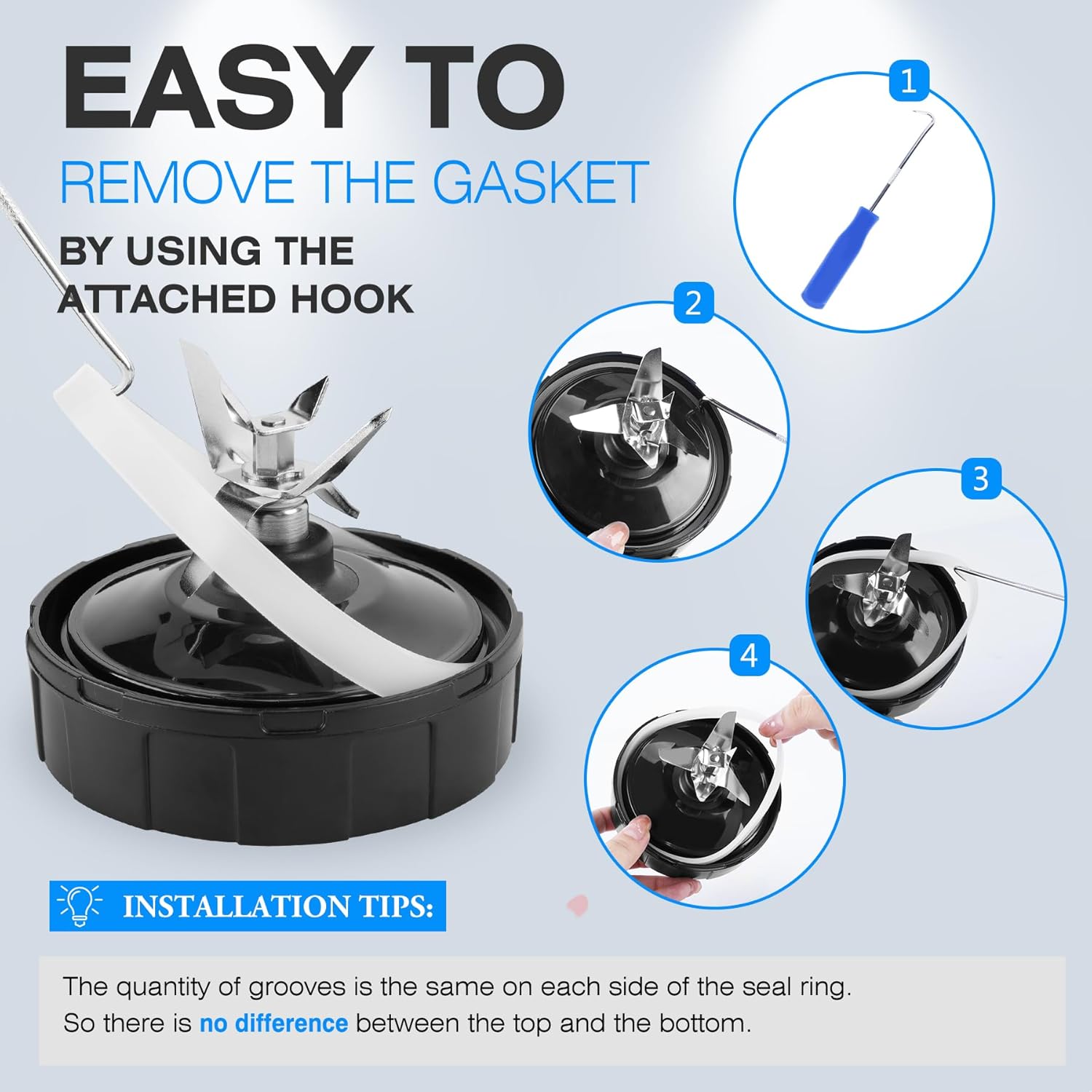 Easier to Install: The grooves are the same on each side of the seal ring. No need to confirm the front and back. Before replacement, please take out the old gasket by using the attached hooks. Check and clean up the gap of the blender blade. Press the new rubber gasket by using the hooks to ensure it can be placed smoothly to avoid the liquid leak