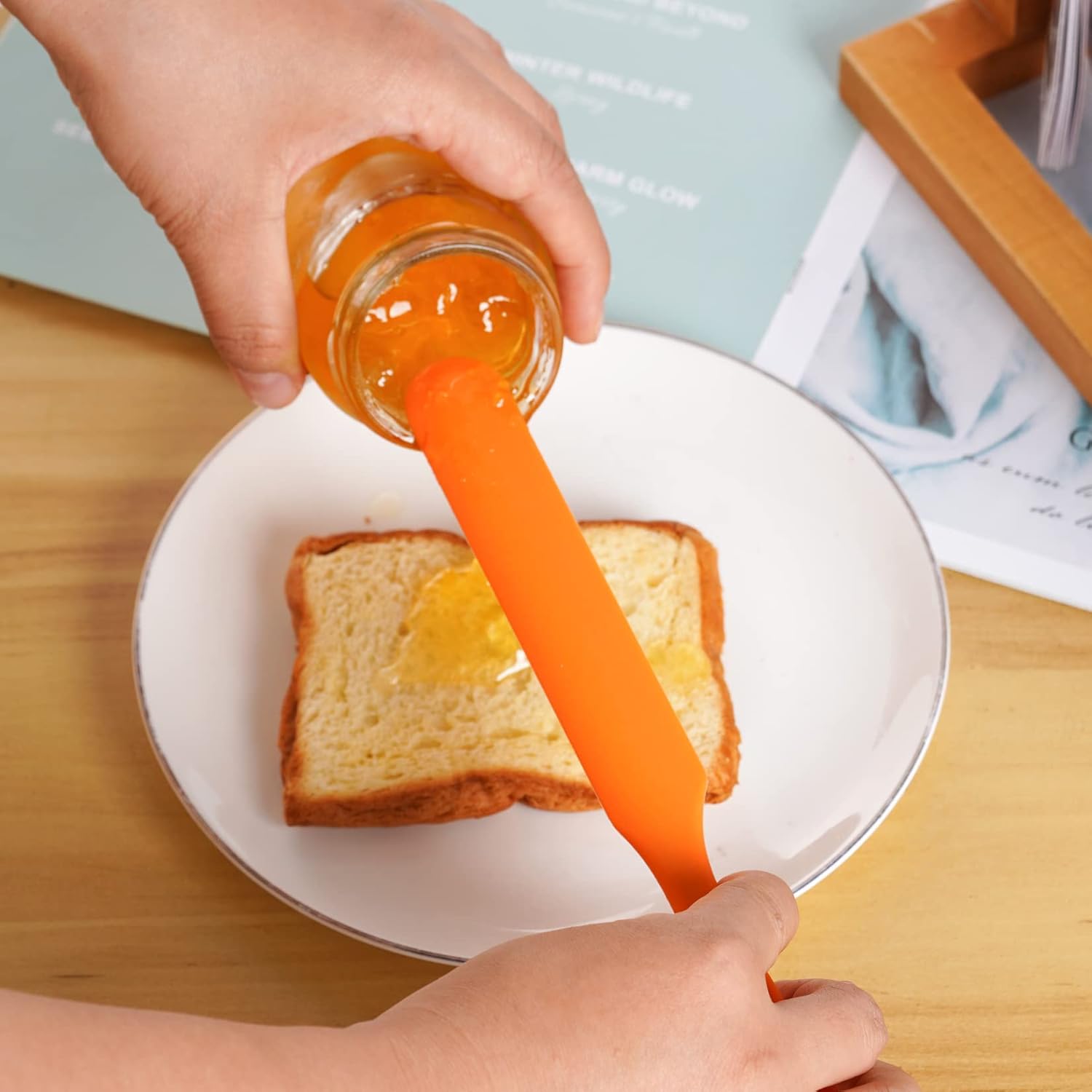 BRIGHT COLORS: Package include 6 pieces of silicone spatulas in 6 colors, including red, orange, blue, green, yellow, purple. Bright colors are easy to distinguish. You can choose different colors for different uses. Multifunctional jar spatulas have different thicknesses on both sides, used in various appliances. They are great gift for wife, family and friends