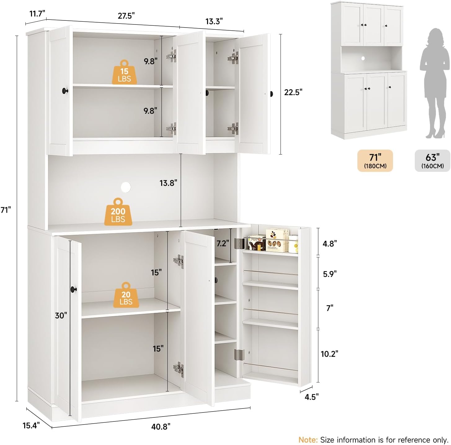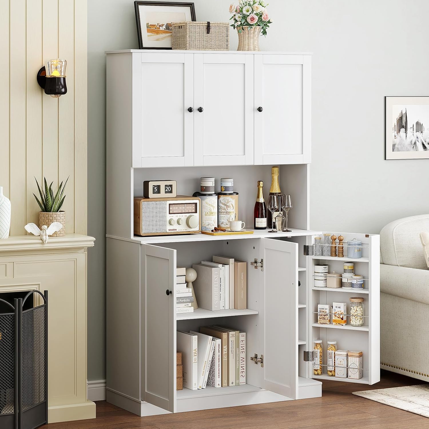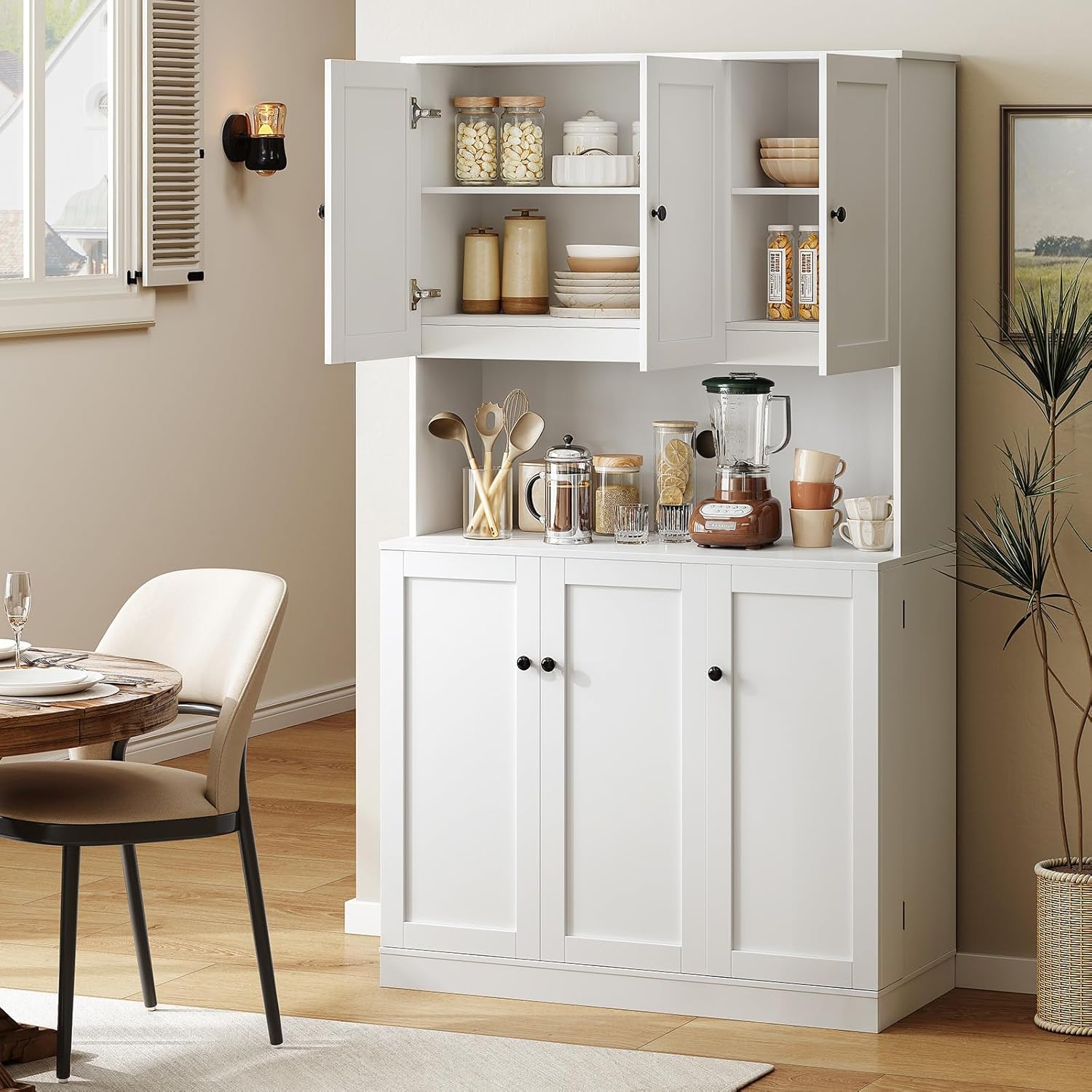 71″ Tall Kitchen Pantry Storage Cabinet with Microwave Stand & Door Shelf, Freestanding Kitchen Hutch with 6 Doors and Adjustable Shelves, Modern Food Pantry for Kitchen, Dining Room, White