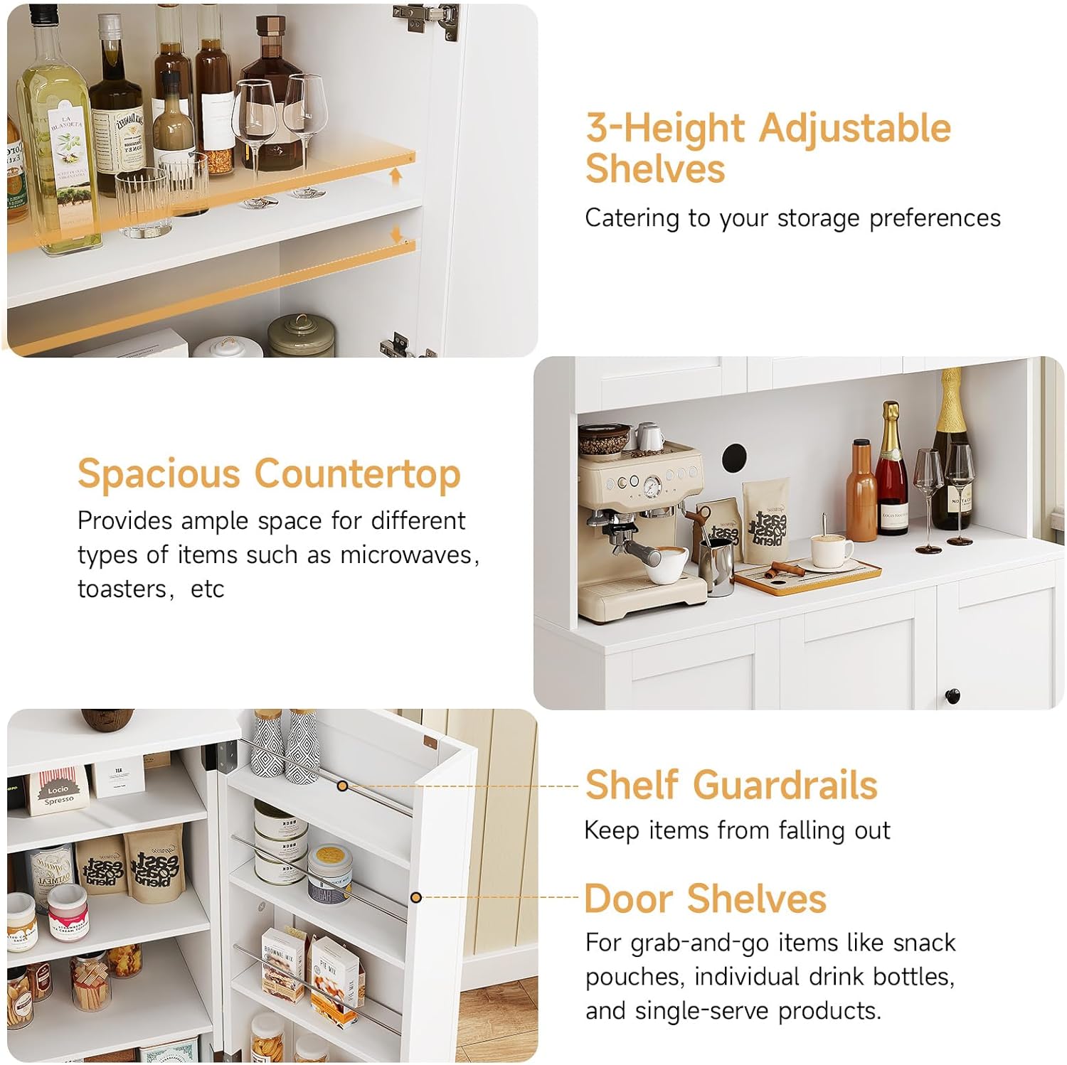 STABILITY AND SECURITY: Using the wall connection fixer included securing this kitchen pantry buffet cabinet at the back to the wall for security concerns. The quality material of the pantry cabinets for kitchen storage can make the pantry cabinet extra solid for daily use. The surface is watertight for easy maintenance.
