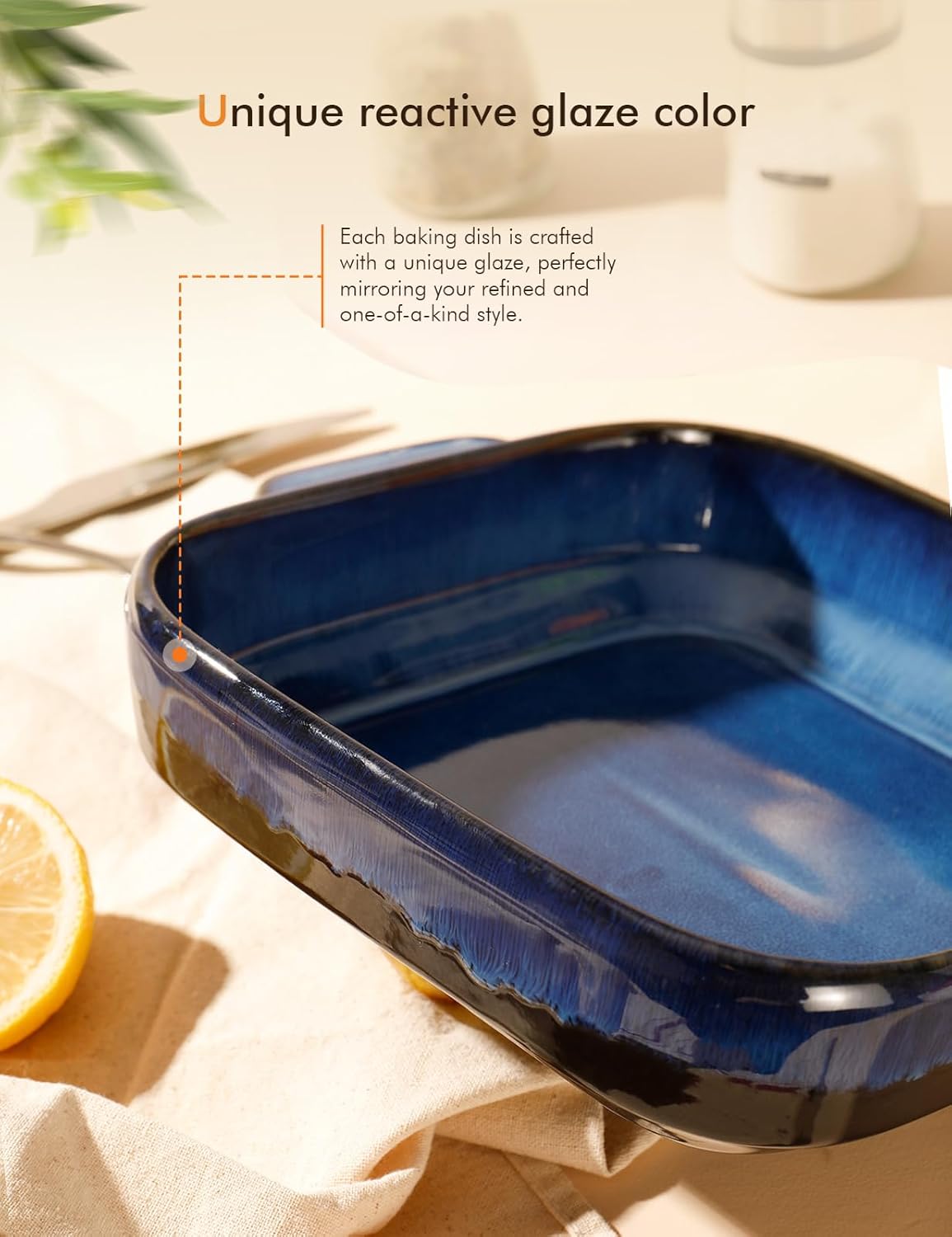 Unique Reactive Glaze:Each baking dish features a unique pattern created by its reactive glaze, making it a stunning centerpiece on your dining table. The glaze is scratch-resistant, lead-free, and cadmium-free, ensuring safe daily use. This baking dish’s artistic design adds a touch of elegance and sophistication to your kitchen and dining experience.
