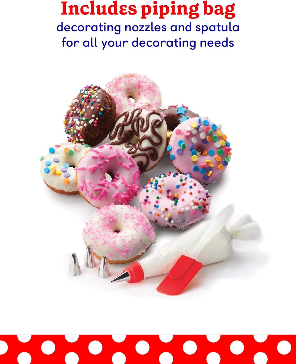 Accessories Included: This mini doughnut maker includes fantastic mini donuts accessories like a piping bag for frosting with nozzles and even a spatula for all your decorating needs.