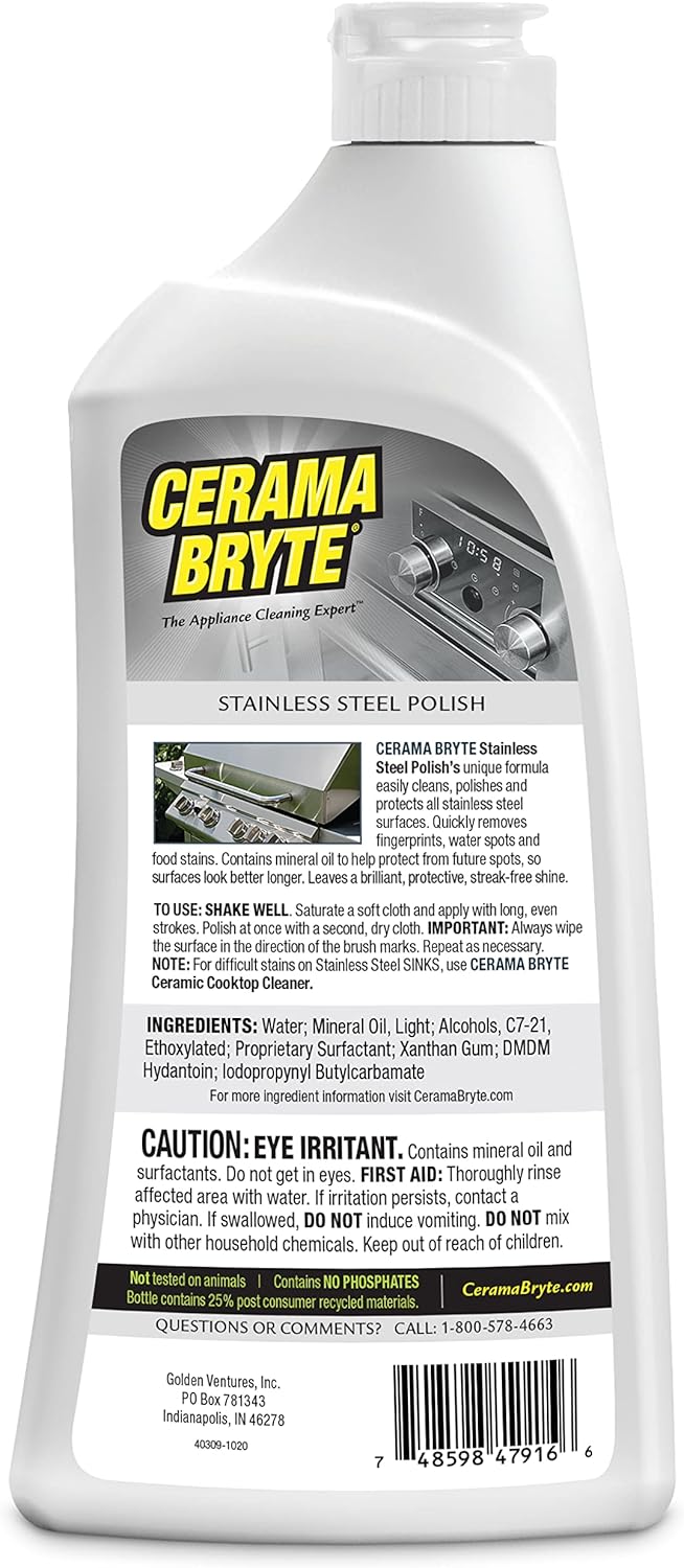 Cerama Bryte Stainless Steel Polish is the perfect solution for removing fingerprints, water spots, and food stains from any stainless-steel fridge, microwave, range, dishwasher, and more. Our high-strength mineral oil formula quickly and easily removes food splatters and stains while protecting surfaces from new fingerprints and maintaining a beautiful shine leaving your appliance looking as good as new. Add polish to a microfiber cloth, apply to your kitchen appliance in long even stokes in the direction of the metal grain, and buff with a dry cloth. This easy to use, streak-free formula leaves a protective barrier that resists fingerprints, dust, dirt, and smudges.