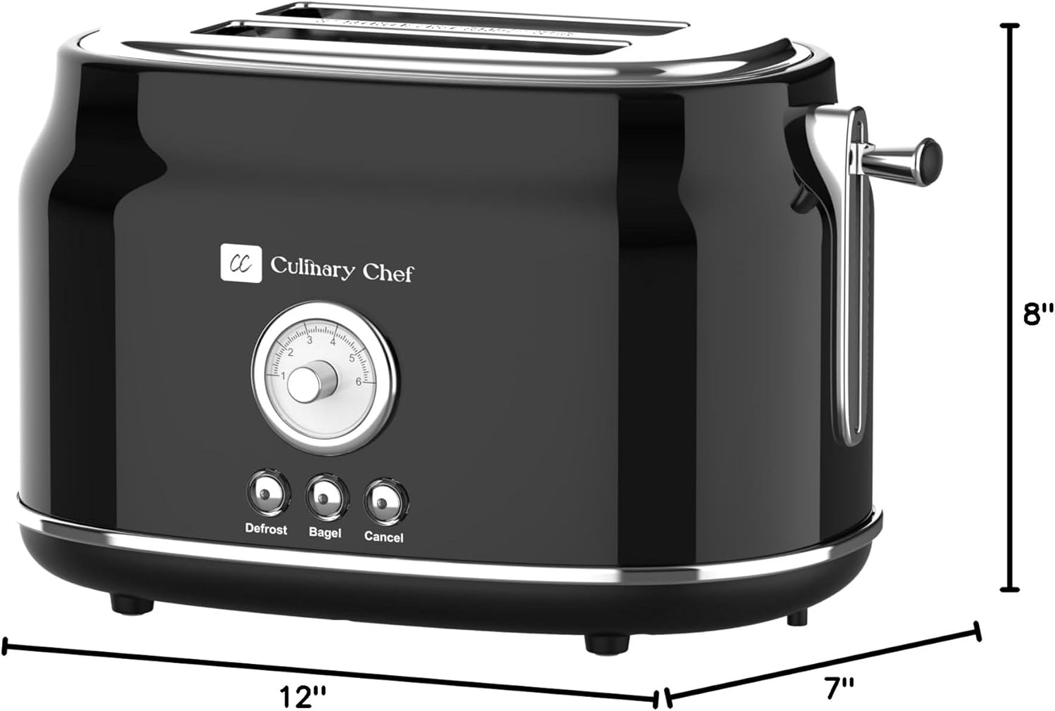 CULINARY CHEF, 2 Slice Toaster, Retro Style, Wide Slot for Bread, English Muffins, Croissants, and Bagels, 6 Adjustable Toast Settings, Cancel and Defrost, 900w, Black