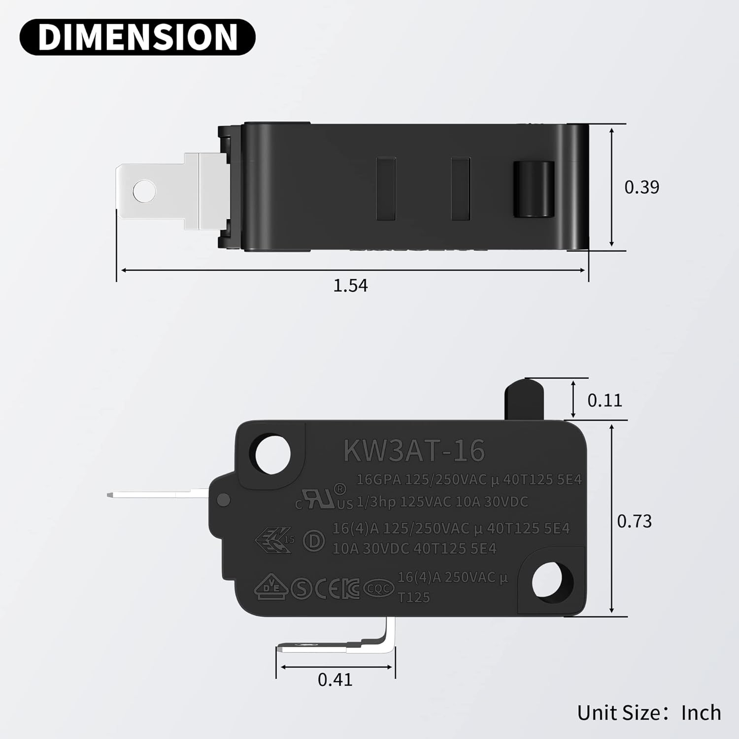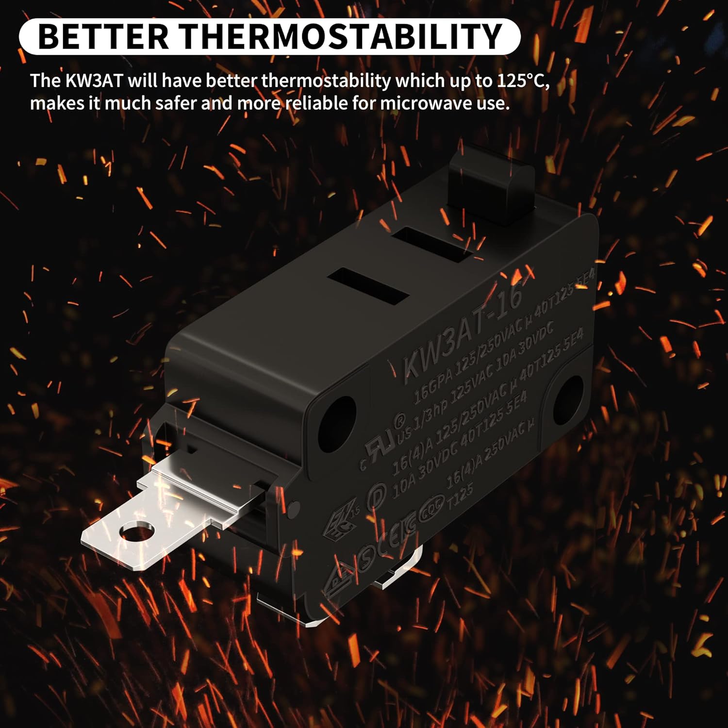 Thermostability: The kw3at-16 microwave switch will have better thermostability which up to 125°C compared with kw3a, much safer and more reliable for microwave use. KW3AT-16 have the same dimesion as kw3a and will fit for most brands of microwave ovens, such as GE, LG, Kenmore, Frigidaire, Sumsung, etc.