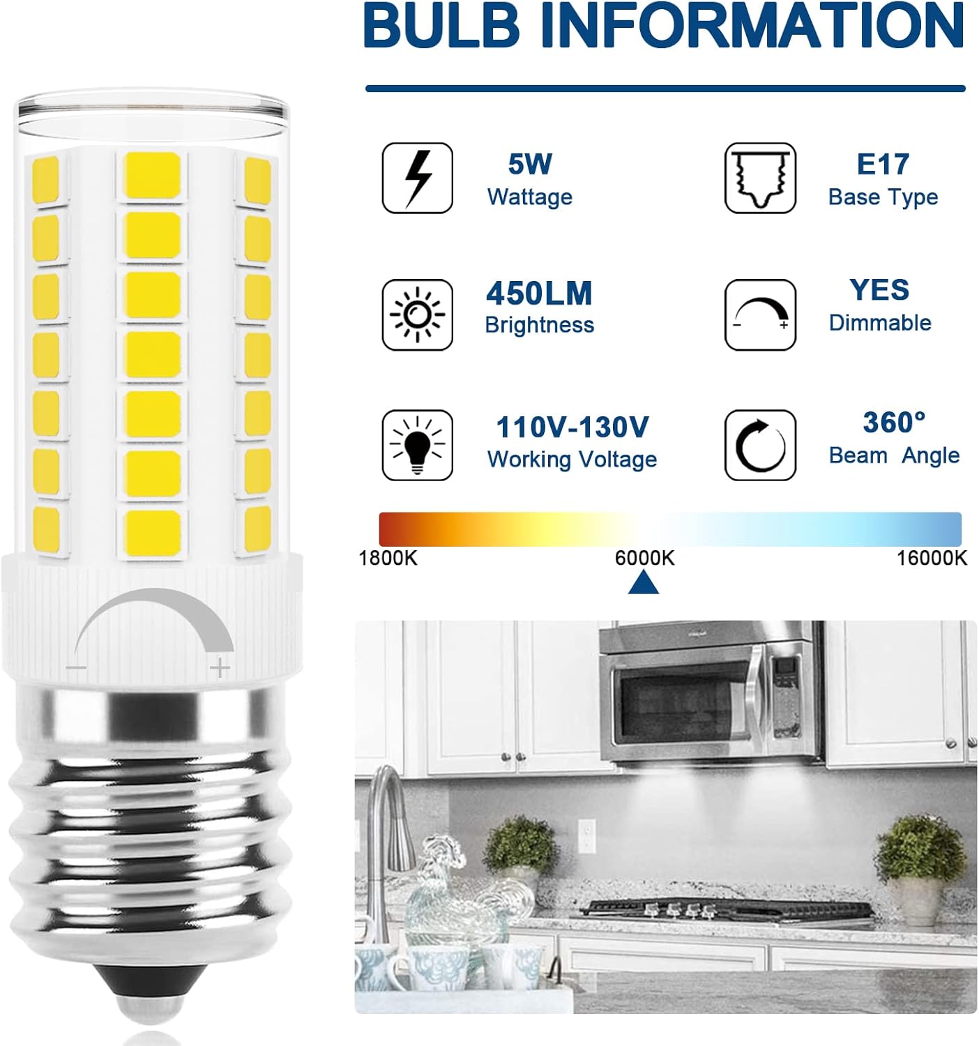 E17 Led Bulb Microwave Oven Light, Over Stove Appliance Replacement 40W Incandescent for Refrigerator, Range Hood, Dimmable, 120V 5W 450LM Daylight White 6000K, E17 Intermediate Base, Pack of 2
