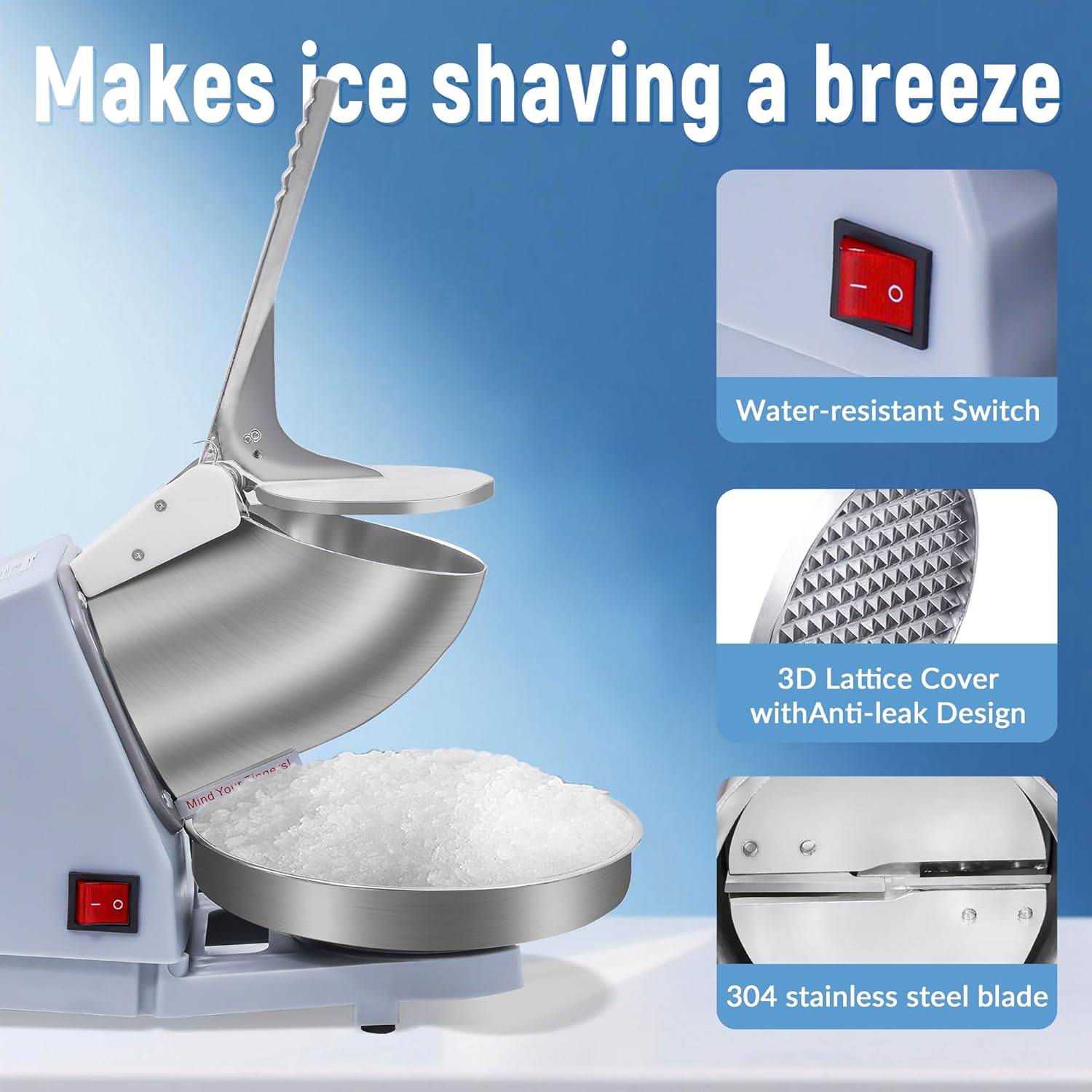 Food-grade, non-corrosive stainless steel blades and ice bowl ensure longer lifespan, rust resistance, and hygiene, guaranteeing food safety and ease of use.