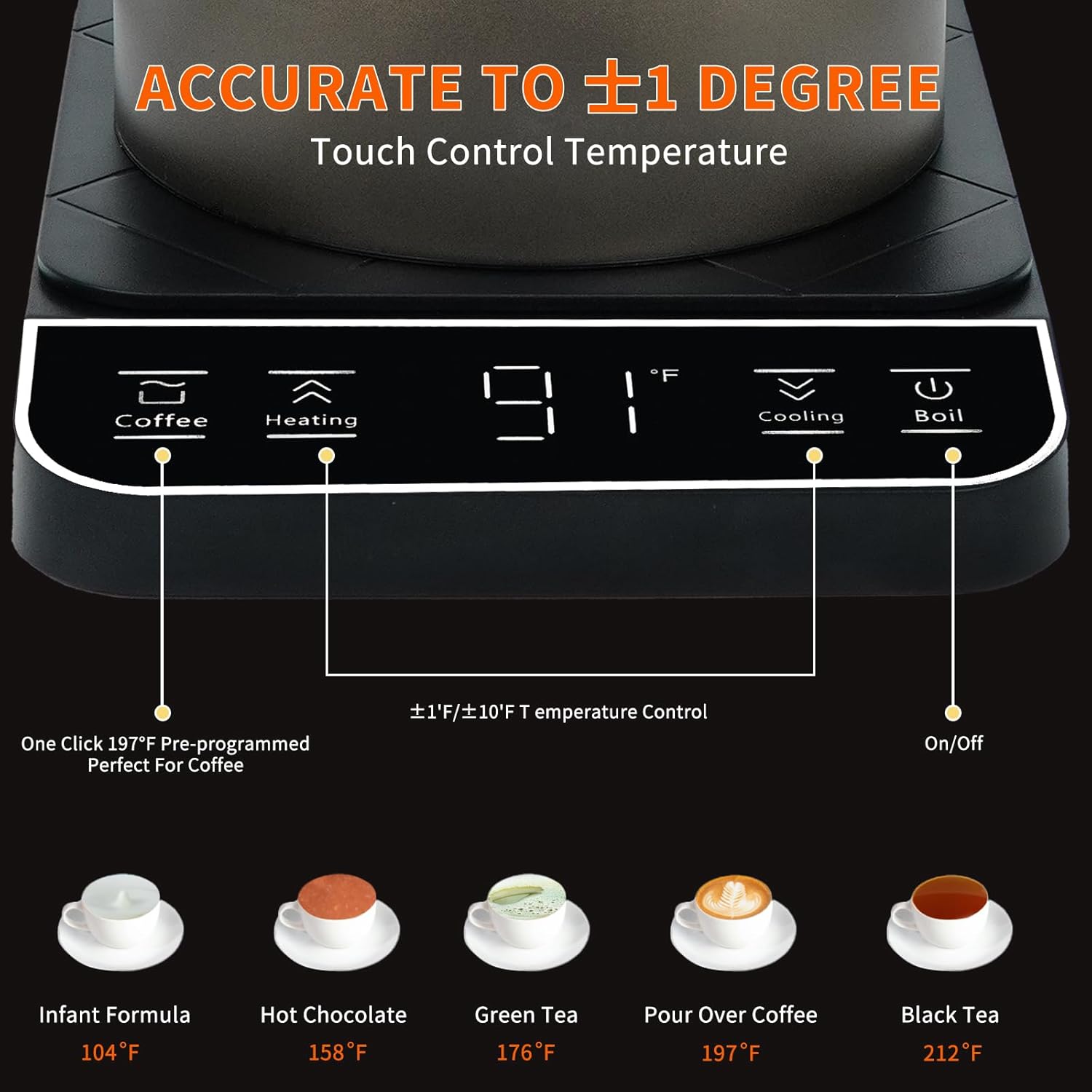 【±1°F Precise Adjustment】: Smart base has a built-in advanced temperature control system with an LCD display that can display real-time and set temperatures. The program adjusts the heating power when the water temperature is close to the desired temperature based on the temperature change detected by the temperature probe.