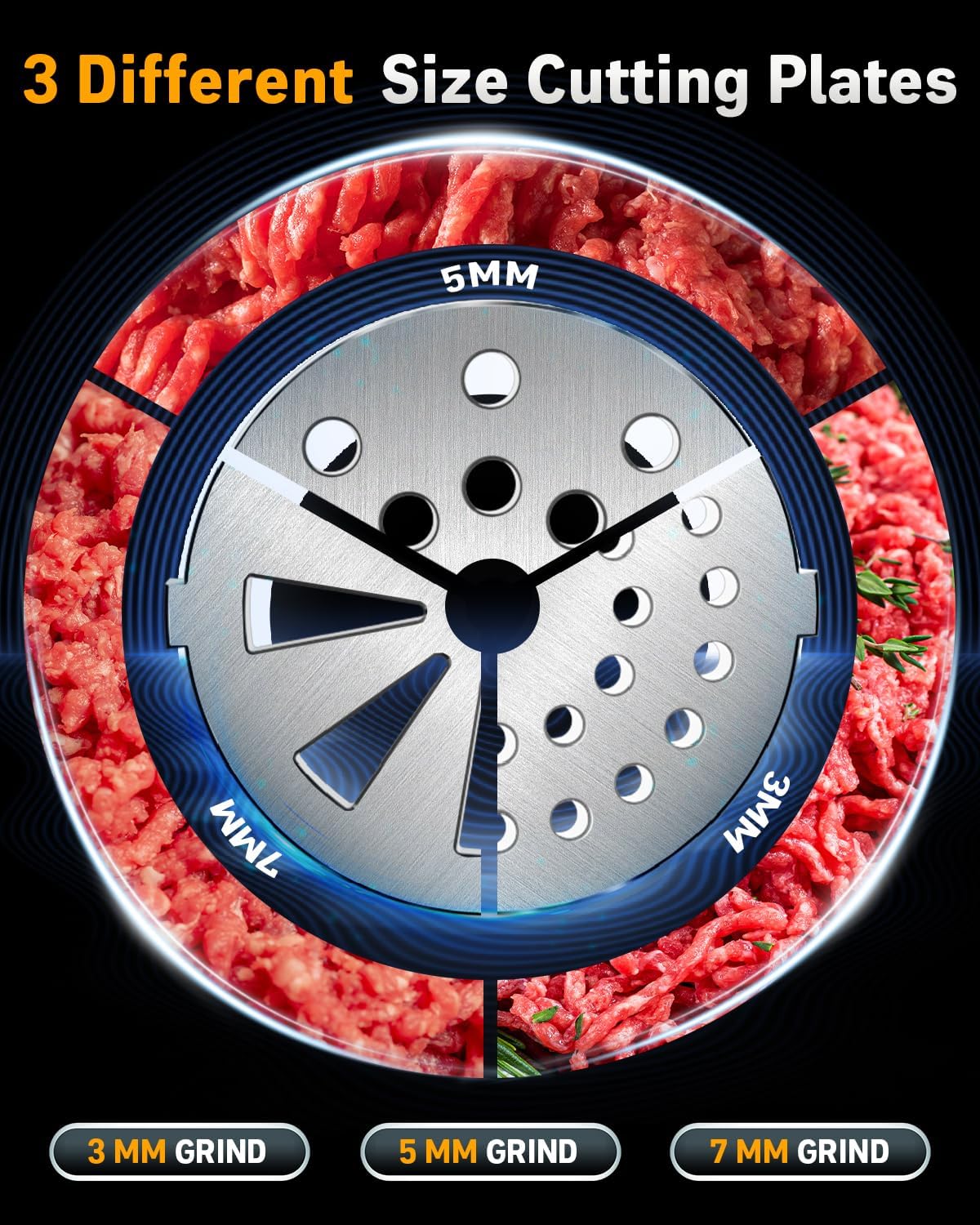 【FOOD GRADE PARTS】Crafted from premium food-grade materials, accessories of this electric meat grinder assure safety, corrosion resistance, easy cleaning, high temperature resistance, and durability. Using a meat grinder in conjunction with food-grade stainless steel components significantly extends its lifespan, up to 30%.