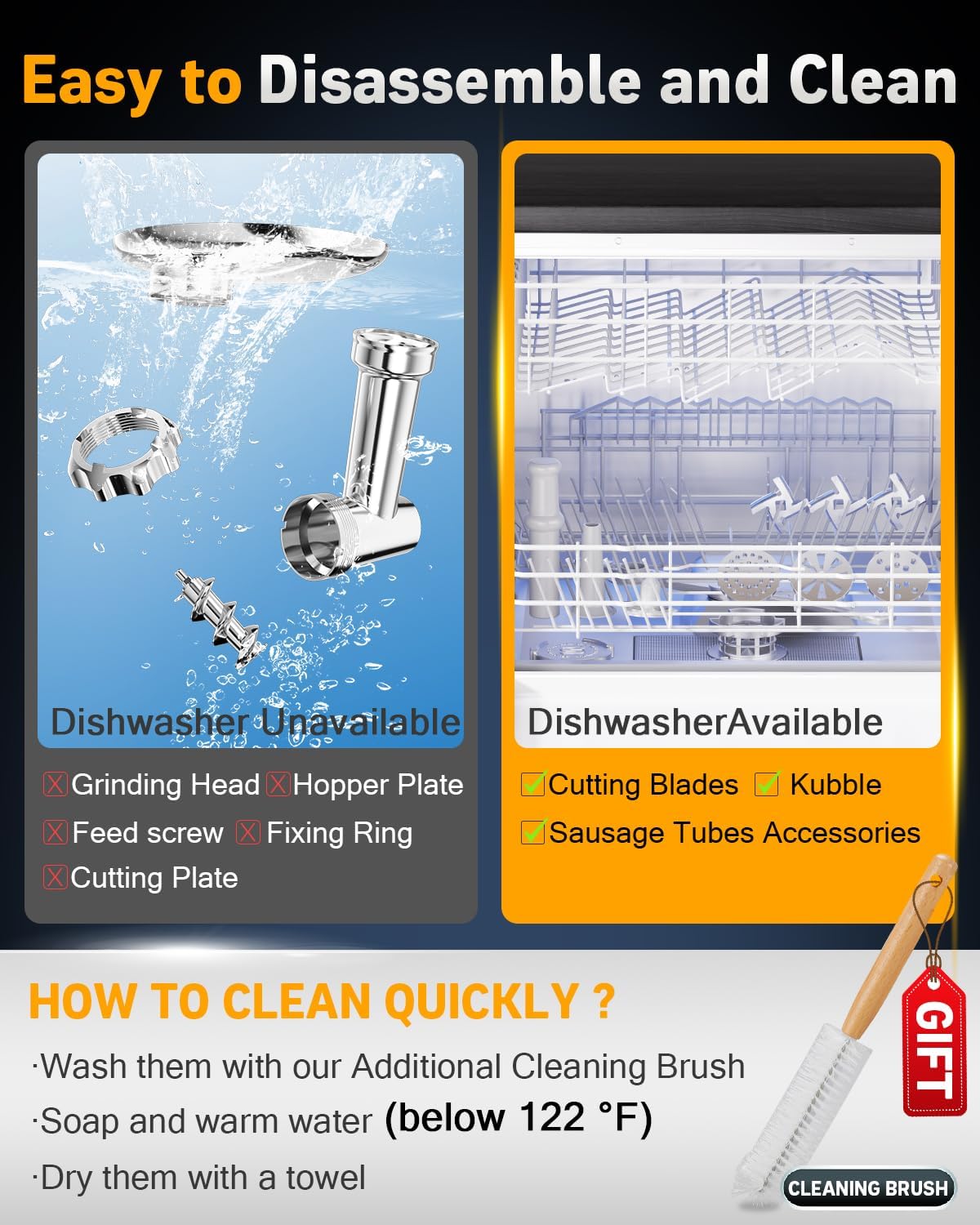【EASY CLEANING】This meat mincer is incredibly easy to clean and assemble or disassemble. For cleaning, make sure to thoroughly wash all parts with warm water and a neutral detergent. PLEASE NOTE THAT THIS PRODUCT IS NOT DISHWASHER SAFE.
