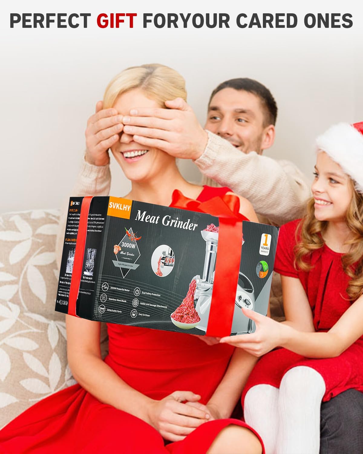 【SUPERIOR POWERFUL&UPGRADED MOTOR】NOTES: BE SURE NOT TO INCLUDE TOO MANY TENDONS. SVKLHY electric meat grinder features a robust motor (3000W MAX, 20% More Powerful), enabling you to quickly grind large quantities of meat. Its high efficiency saves you time and effort, making it an indispensable tool for home cooks and professional chefs alike. Ideal for beef, chicken, pork, fish, and more, this versatile meat grinder is a must-have for any kitchen.