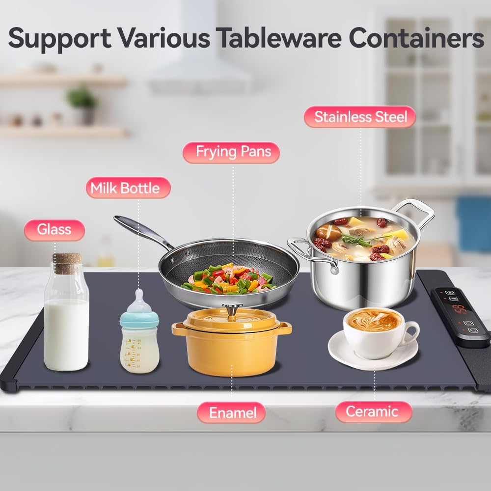 Compatible with Various Tableware: Our food warming mat is compatible with many different types of cutlery, such as metal, ceramic, glass, enamel cutlery, ect. However, it is recommended that plastic or sealed cutlery not be heated directly