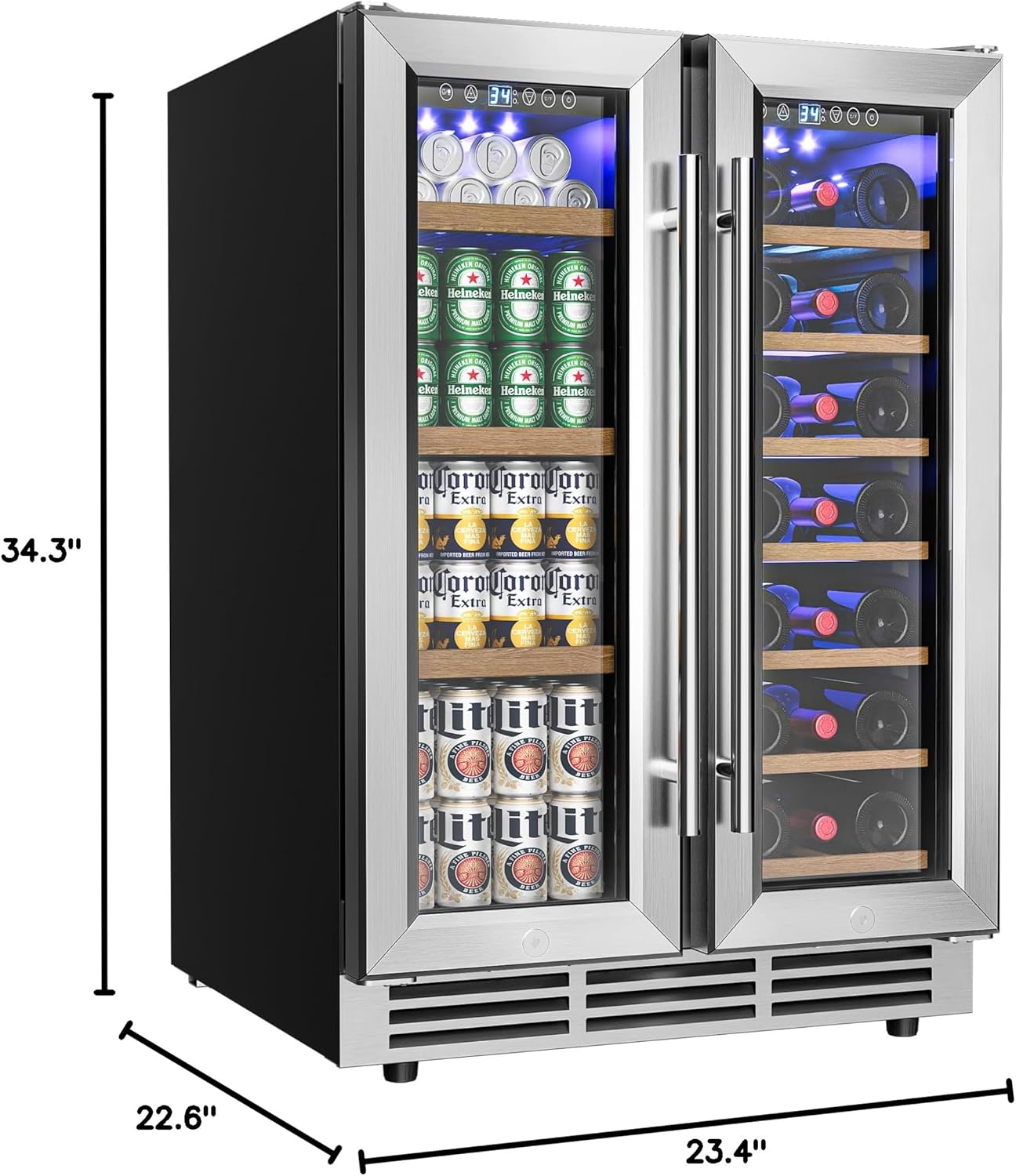 MULTIPURPOSE WITH ONE CABINET – Our wine and beverage refrigerator is designed with two cooling zones that can be temperature controlled independently. The left beverage zone is 35°F-50°F for beer, juice, and cola, and the right wine zone is 41°F-64°F for your treasured reds and sparkling wines. Our wine fridge has 7 wooden shelves as well as 3 wire shelves which are removable, and the large capacity of the beverage refrigerator can easily hold 21 bottles of wine and 80 cans of 330ml drinks