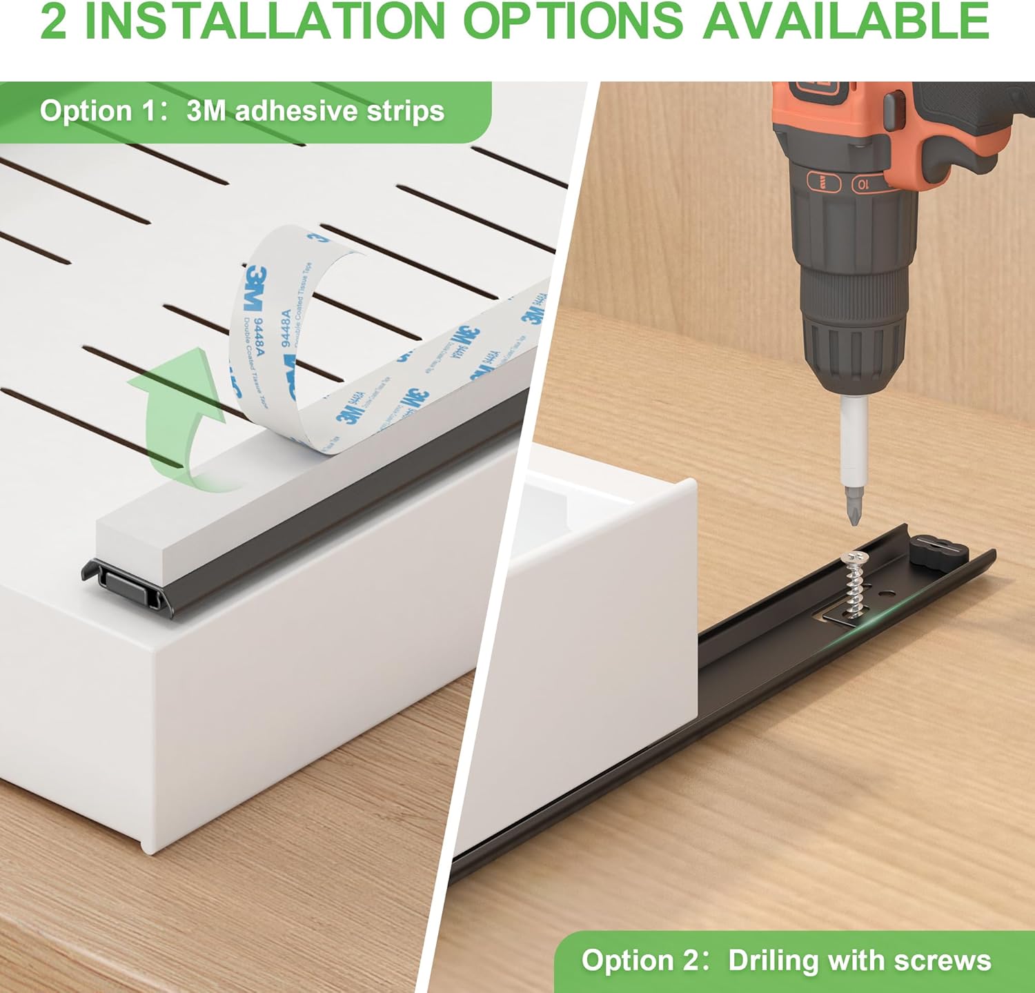 【Dual Installation Options】Choose adhesive-only setup (3M strips & Nami strips) for use or add screws for permanent stability. Upgraded and thickened 3M tape for cabinet lips <=0.4 inches in height