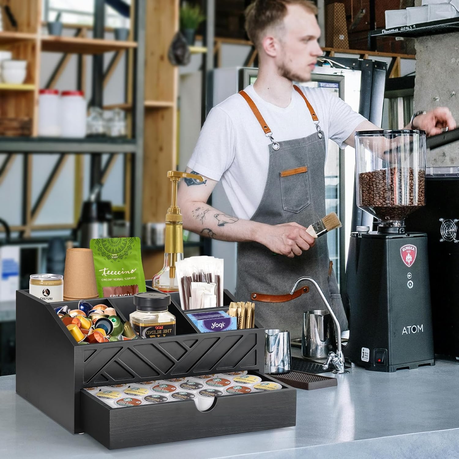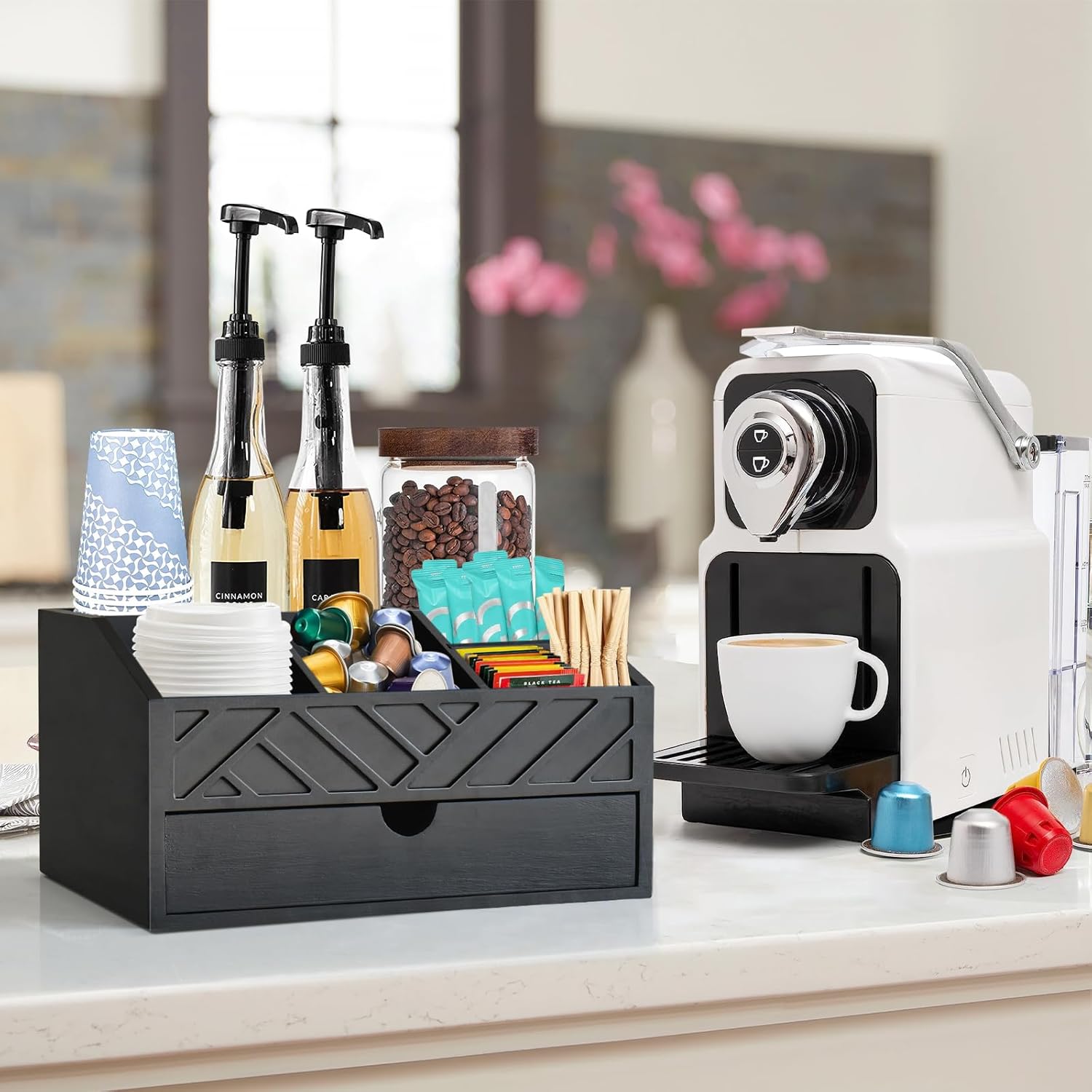 The coffee bar organizer is strategically designed with 6 compartments and a drawer, making it versatile for storing various items such as tea bags, coffee syrup, cups, straws, stir sticks and other coffee bar accessories. The drawer is easy to pull out and can accommodate coffee pods of most sizes.