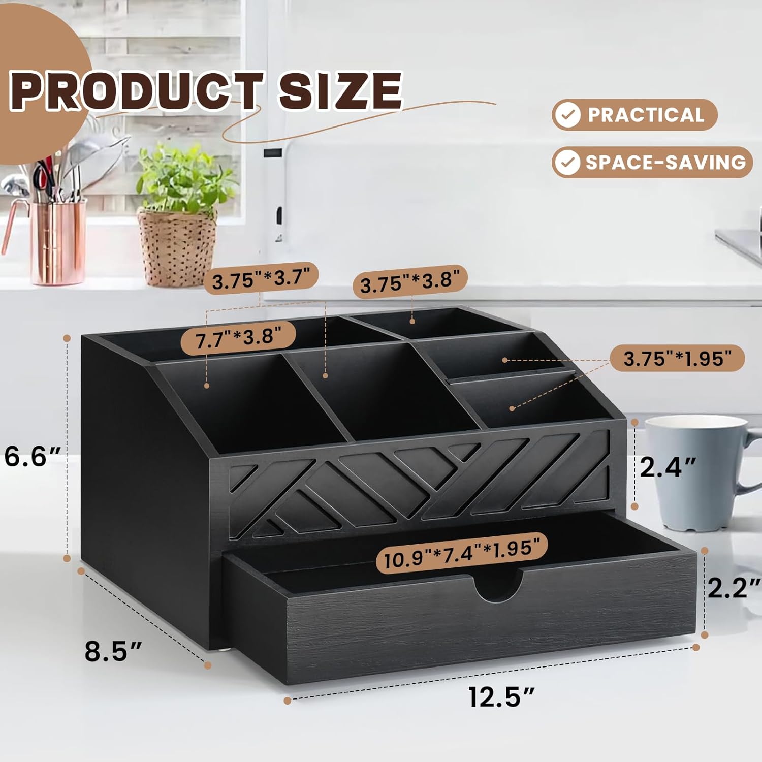 【Large Capacity Coffee Station Organizer with Drawer】The coffee bar organizer is strategically designed with 6 compartments and a drawer, making it versatile for storing various items such as tea bags, coffee syrup, coffee cups, straws, stir sticks and other coffee bar accessories. The hidden drawer is easy to pull out and can accommodate coffee pods of most sizes. This coffee pod holder can get rid of the clutter on the coffee bar counter, allowing you to enjoy every coffee moment elegantly