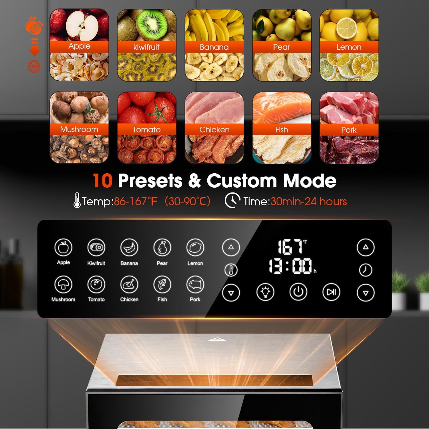Precise Time & Temp Control – Food dehydrator can adjust temp (95-167°F in 5°F steps) and timer (1-48hrs in 30-min steps). Suitable for different foods, like jerky, fruit, meat, herb, beef, mushroom.