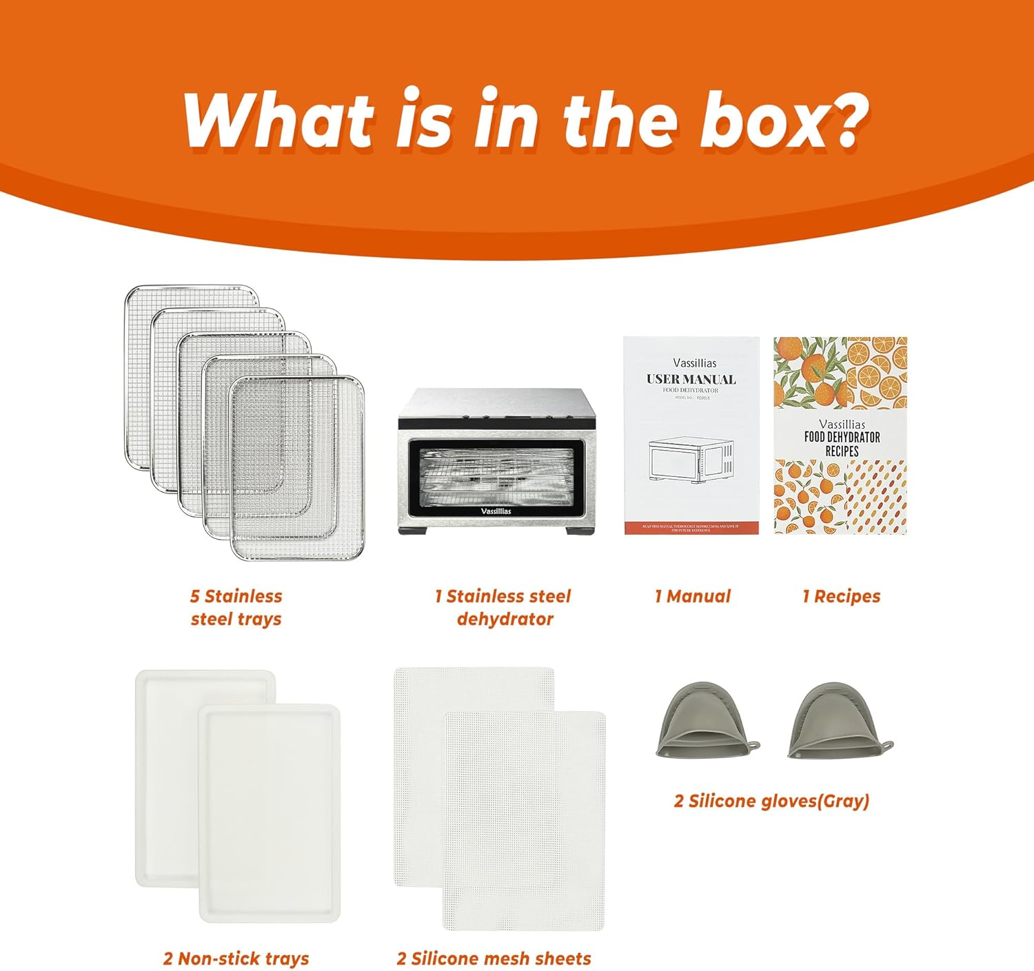 WHAT’S IN BOX – Included 1 stainless steel dehydrator, 5 stainless steel trays, 2 silicone mesh trays for drying fine foods, 2 trays for catching water or making fruit roll-ups, 2 silicone gloves, 1 recipes and 1 manual