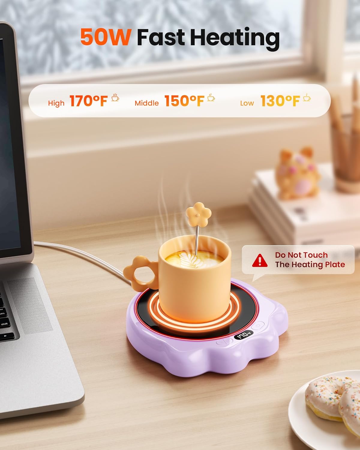 3 Temperature Settings: Faster heat cup warmer with temp Illumination, one button easy to adjust the 3 temperature, 170℉(Red Light), 150℉(Purple Light), 130℉(Blue Light); The LED digital display show the temperature and timed, keep your beverage stays warm