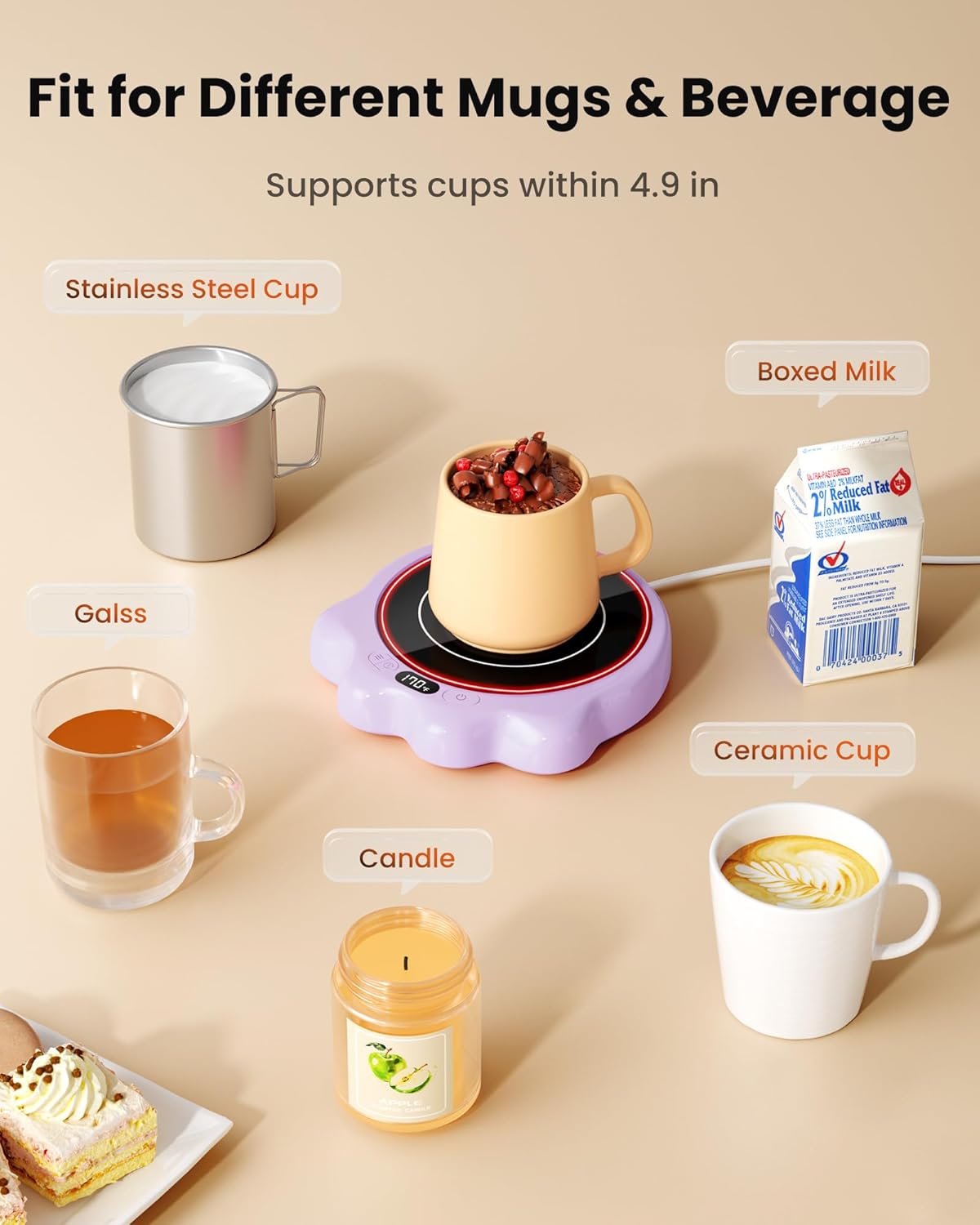 Fit for Different Mugs: This tea warmer with 3.1 in heating plate, suitable for different cups, glass cups, ceramic mugs, stainless steel cups, is work best for flat bottomed cups; The coffee warmer plate can also heating beverages, tea, boxed milk, cocoa, chocolate