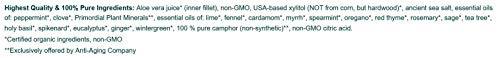 You will love this zesty peppermint tasting full strength mouthwash — Certified organic ingredients and Non-GMO verified — NO water — NO glycerin fillers to coat your teeth — NO propyl betaine — NO alcohol or anything artificial. Highest quality 100% undiluted organic (inner fillet) aloe vera. Aloe vera has been shown in laboratory tests to stimulate skin growth.