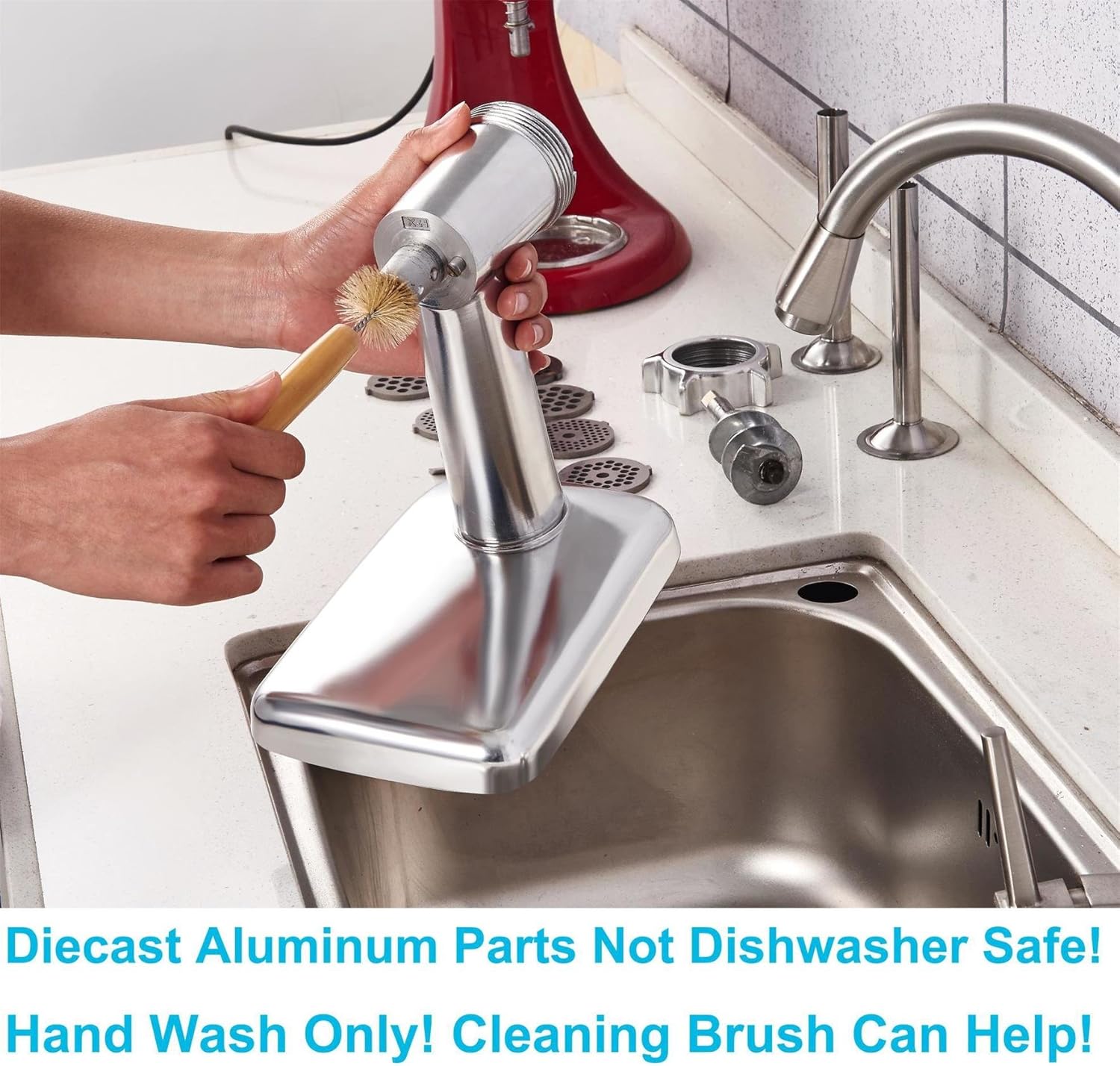 [Easy to Use & Clean ] All parts for kitchen aid meat grinder attachment for kitchenaid stand mixer are detachable and metal shinning finishing easily clean! The included cleaning brush is recommended for quick cleaning. Not Dishwasher Safe! Need Hand wash