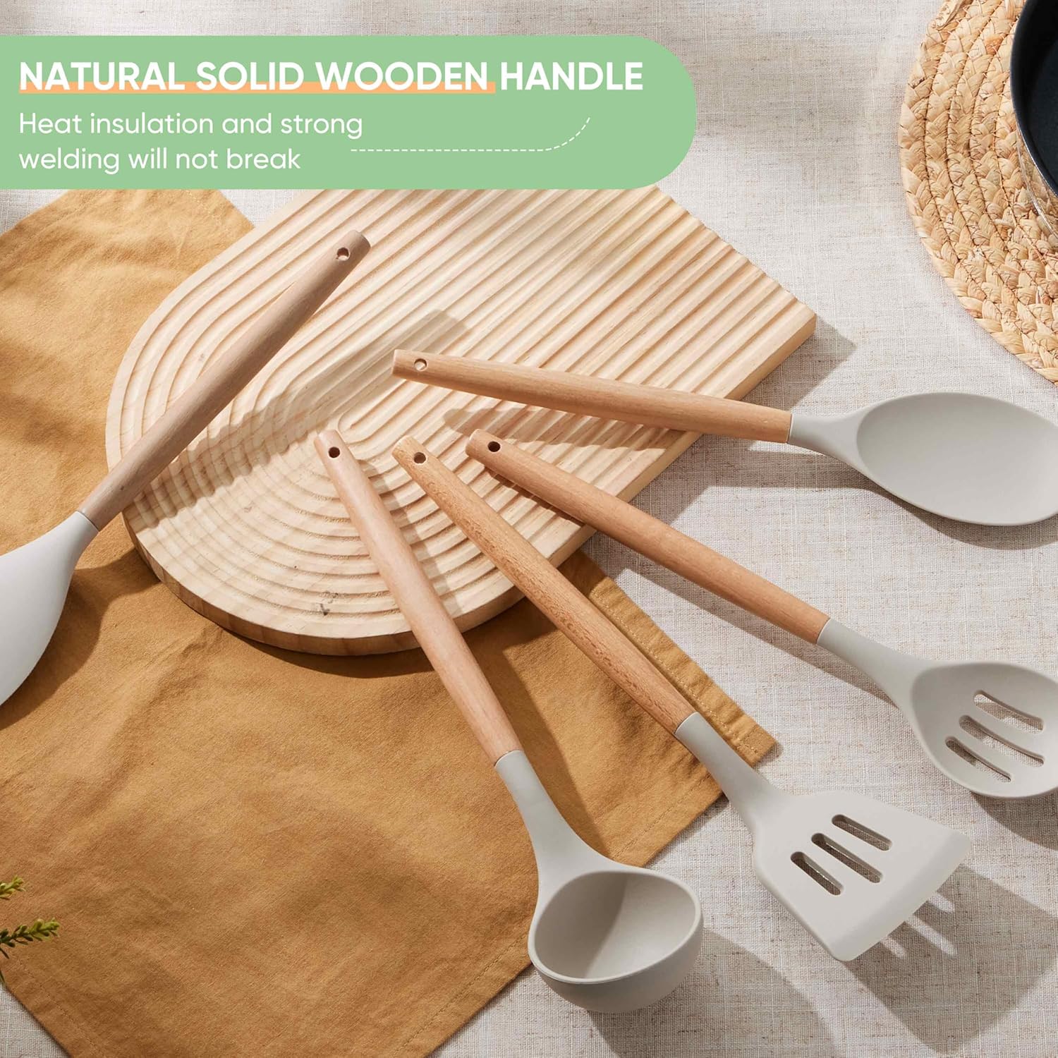 Herogo 5-Piece Cooking Utensils Set, Silicone Kitchen Utensils Set with Wooden Handle, Heat Resistant Cooking Tools Slotted Turner, Spoon, Soup Ladle, Spatula, Spoonula for Nonstick Cookware, Khaki